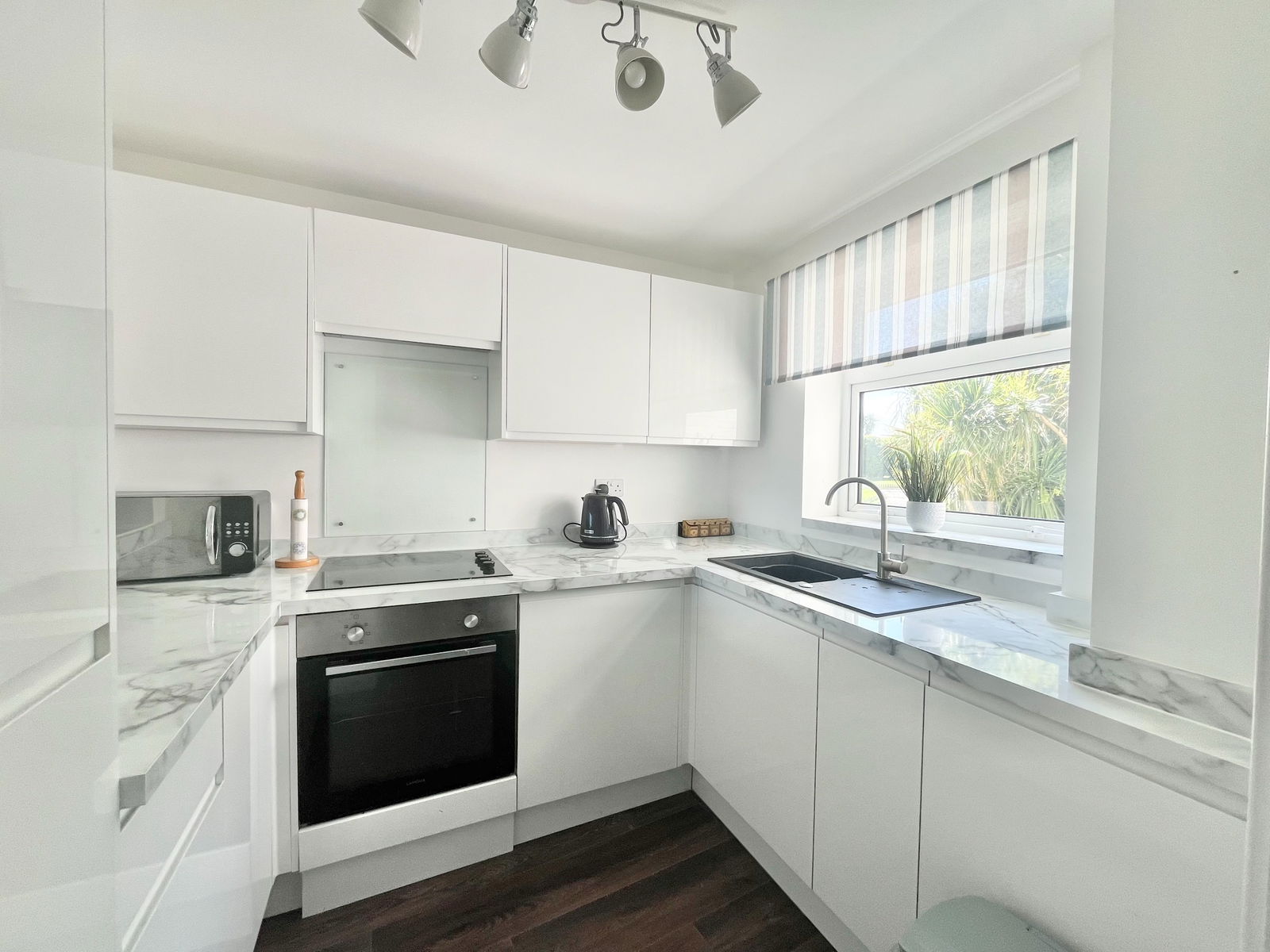 KITCHEN - 6' 11'' x 8' 2'' (2.11m x 2.49m) A super, modern fitted kitchen finished in gloss white faced wall and base cupboards. Marble style working surfaces and inset composite sink and drainer with mixer tap over. Integral fridge/freezer and washer/dryer. Built in under counter electric oven with halogen hob and cooker hood over. Serving hatch to lounge/dining room. Double glazed window to front.