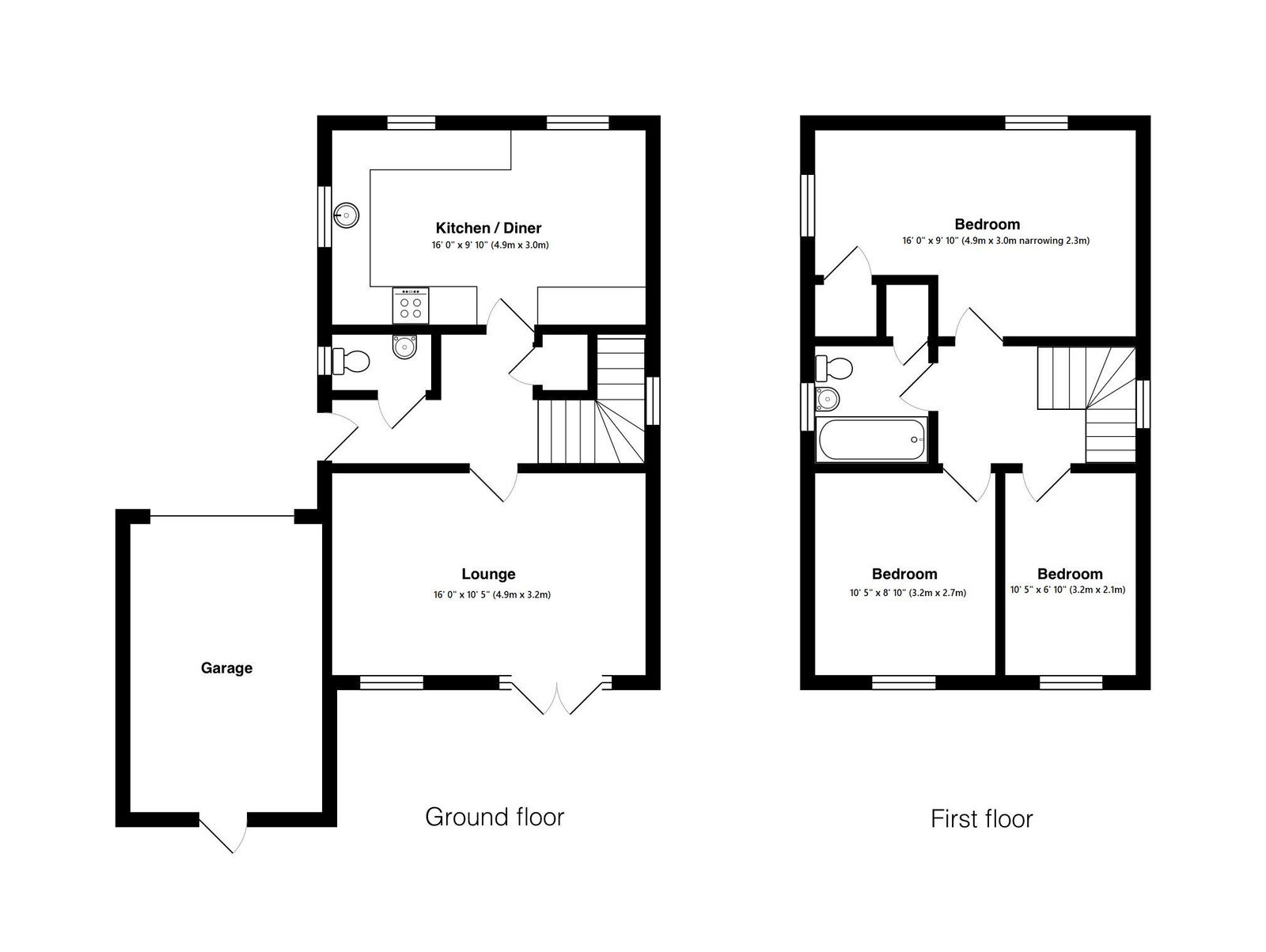 BEDROOM ONE 16' 0" x 9' 10" (4.9m x 3.0m narrowing 2.3m) A large double bedroom with 2 double glazed windows and radiator. There are distant countryside views. Built-in wardrobe. TV point.