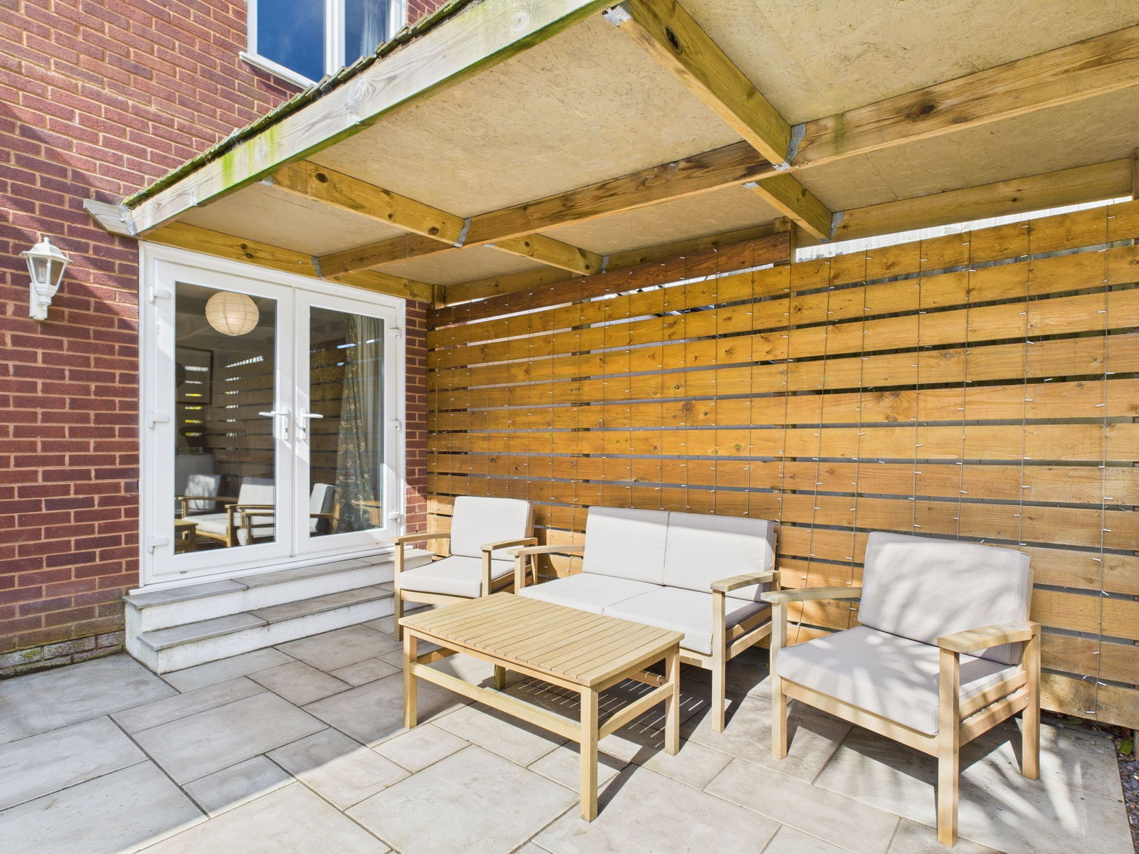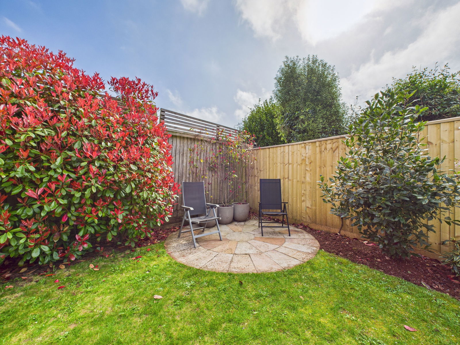 SUNNY REAR GARDEN The rear garden is a good size, having a patio adjacent to the lounge again both of a good size and delightful entertaining area with gazebo to one side. Few steps up to a level lawn with circular patio area to one corner. The garden is enclosed providing high levels of seclusion, from a variety of mature shrubs and fencing.