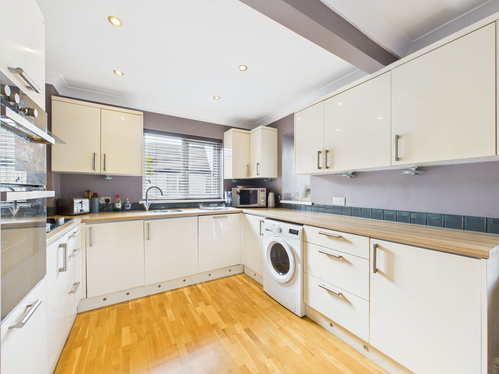 KITCHEN/BREAKFAST ROOM 16' 0" x 9' 10" (4.9m x 3.0m) Fitted with a modern range of high-gloss cream base and wall units with wood effect work surfaces. Stainless steel sink with matching drainer. Integrated Hoover dishwasher. Zanussi fridge freezer, plus built-in Hotpoint double oven with mirror glass front. 4-burner gas hob with stainless steel cooker hood over. Part tiled walls. Plumbing for washing machine. LED lighting to kick-boards. Real oak flooring. 3 double glazed windows. Radiator. LED spotlights to ceiling. Under-cabinet counter-top lighting. Glazed door to hallway.