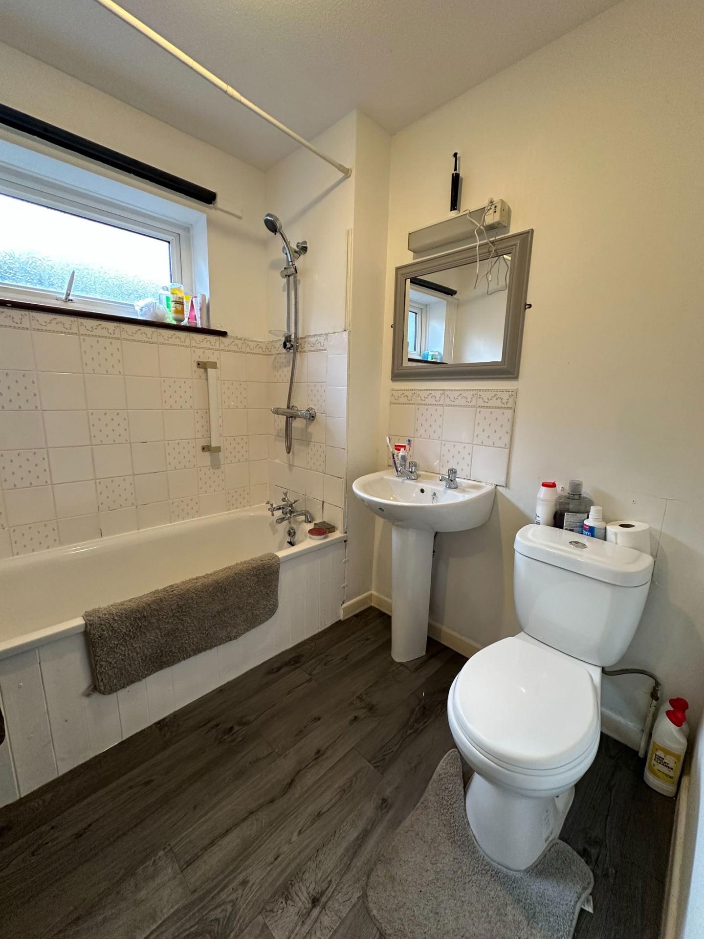 BATHROOM Fitted with a white suite comprising bath with mains shower over, wash hand basin and WC. Part tiled walls. Radiator. Strip light and shaver point. Double glazed window.