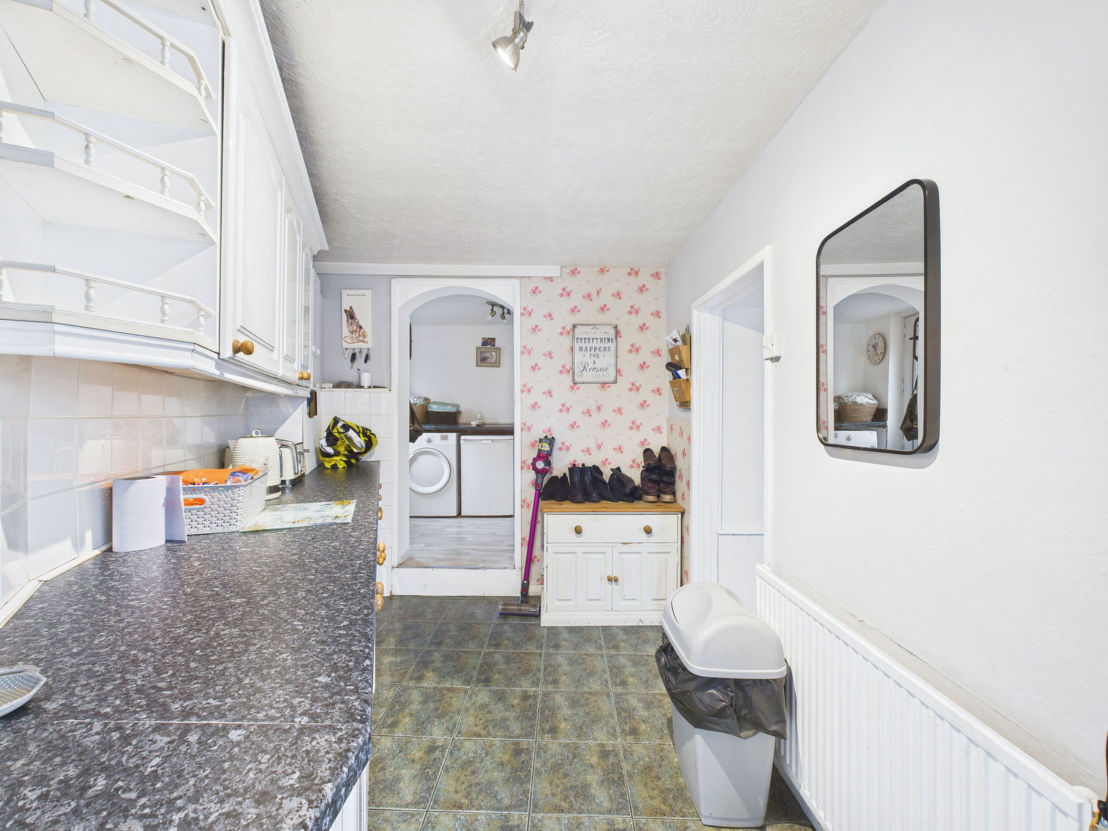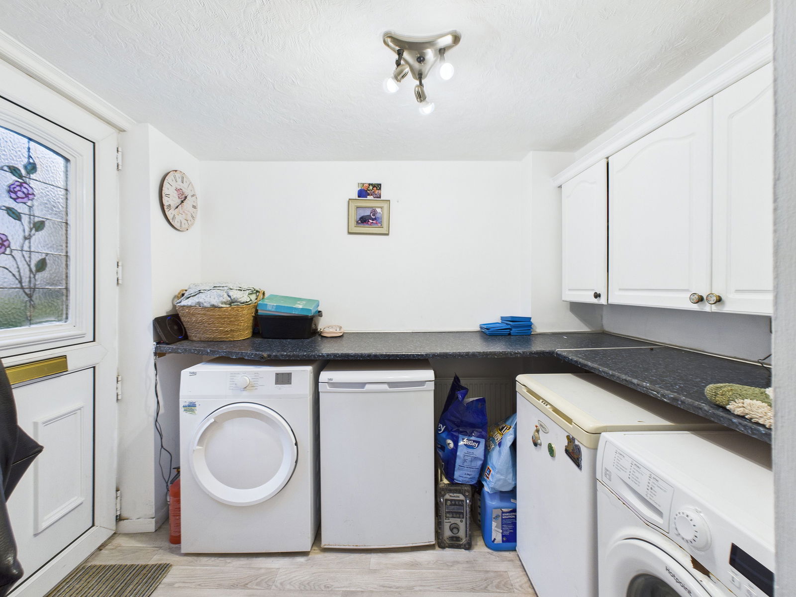 UTLITY Cupboard and work surfaces under, plumbing for washing machine/dryer.