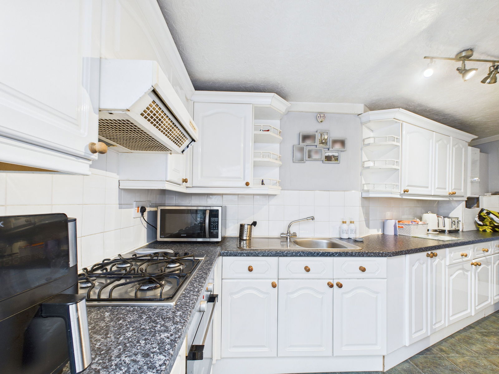 KITCHEN Drawers and cupboards over and under surfaces, built in oven and gas hob, stainless steel sink unit, radiator and door into:-