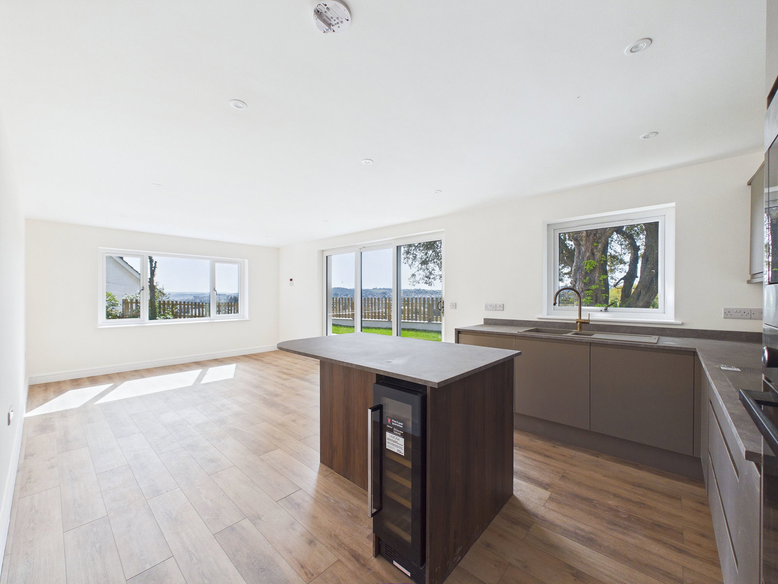 LOUNGE/KITCHEN DINER: A modern open plan area consisting lounger area with windows to rear overlooking the garden, triple sliding doors out to the side garden. A beautifully appointed and spacious kitchen in a modern beige/brown all fitted with a range of contemporary wall and base units. There is range of integrated appliances to include built in oven and microwave, induction hob with glass splash back, dishwasher and fridge/freezer, washer/dryer. There is an island with drawers and cupboards under and space for breakfast stools, along with a wine cooler. window to side garden.