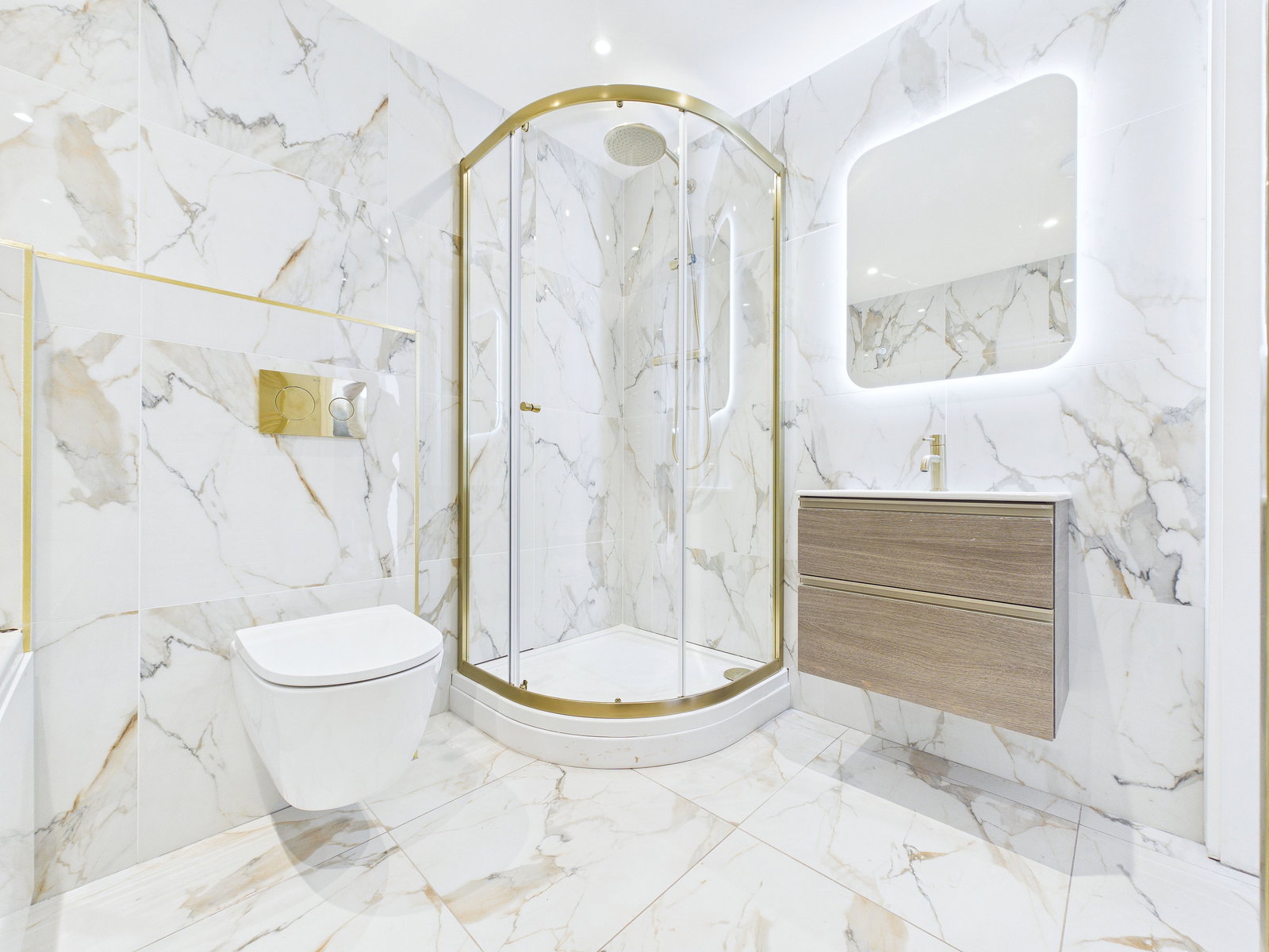 BATHROOM: A large family bathroom expertly finished offering a four piece suite comprising of corner shower cubicle with glass doors, wash hand basin with vanity surround and light up mirror over. Dual flush w.c wall hung radiator, Fully tiled walls and floor. Inset ceiling spotlights.