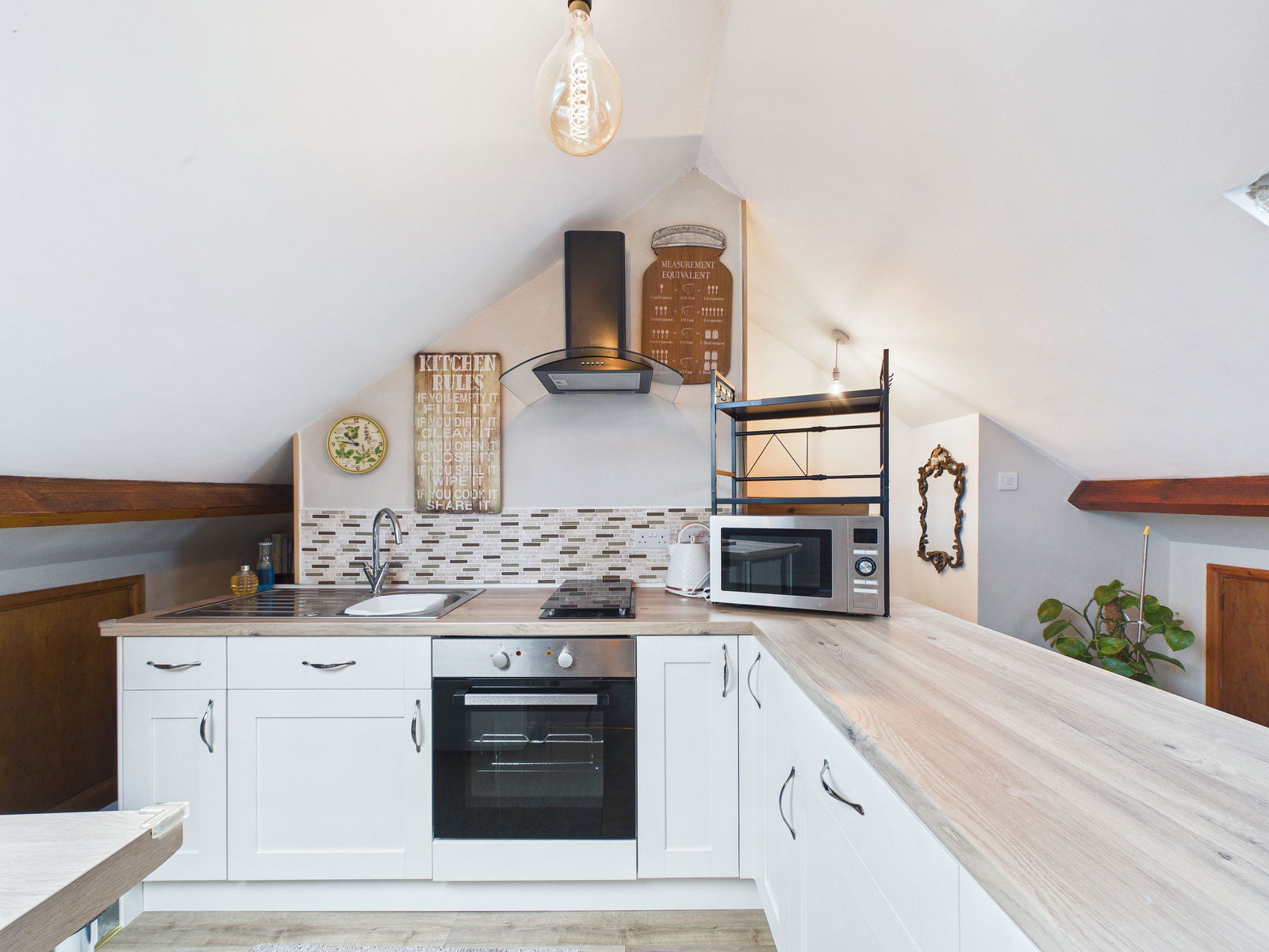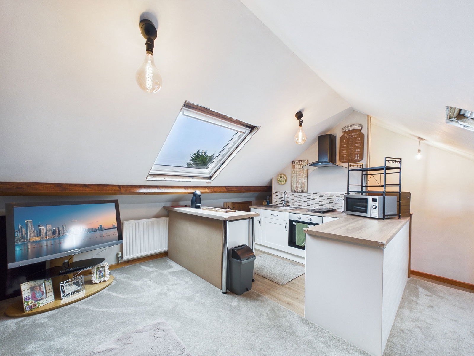 SECONDARY KITCHEN / SNUG - 5.19m x 4.72m (17'0" x 15'5") Accessed via a carpeted staircase from the first floor. A bright and versatile area that is ideal as a secondary kitchen and living space for perhaps an older teen looking for their own space or a mature family member. There is a kitchen area fitted with modern units comprising cupboards and drawers. Modern square edge work surfaces with inset one bowl stainless steel sink unit with mixer tap. Fitted electric oven and fitted electric hob with cooker hood above. A fridge and a freezer included. There is wood effect flooring in this section that opens into a cosy carpeted snug area. Two radiators and two roof windows with fitted blinds. Feature brick chimney breast creating the perfect focal point to the room. Two doors opening into handy eave storage space.