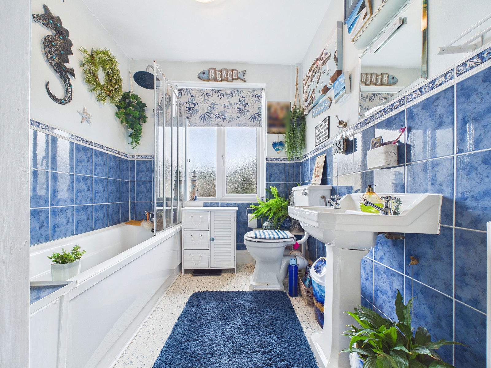 BATHROOM Fitted with a matching three piece white suite comprising a pedestal hand wash basin, WC with separate cistern and a panel fronted bath with newly fitted rain shower system plus hand held shower attachment with shower screen. Partly tiled walls and vinyl hard flooring. Radiator. Cupboard housing the gas combination boiler along with shelved storage space. Frosted double glazed window to the rear aspect.