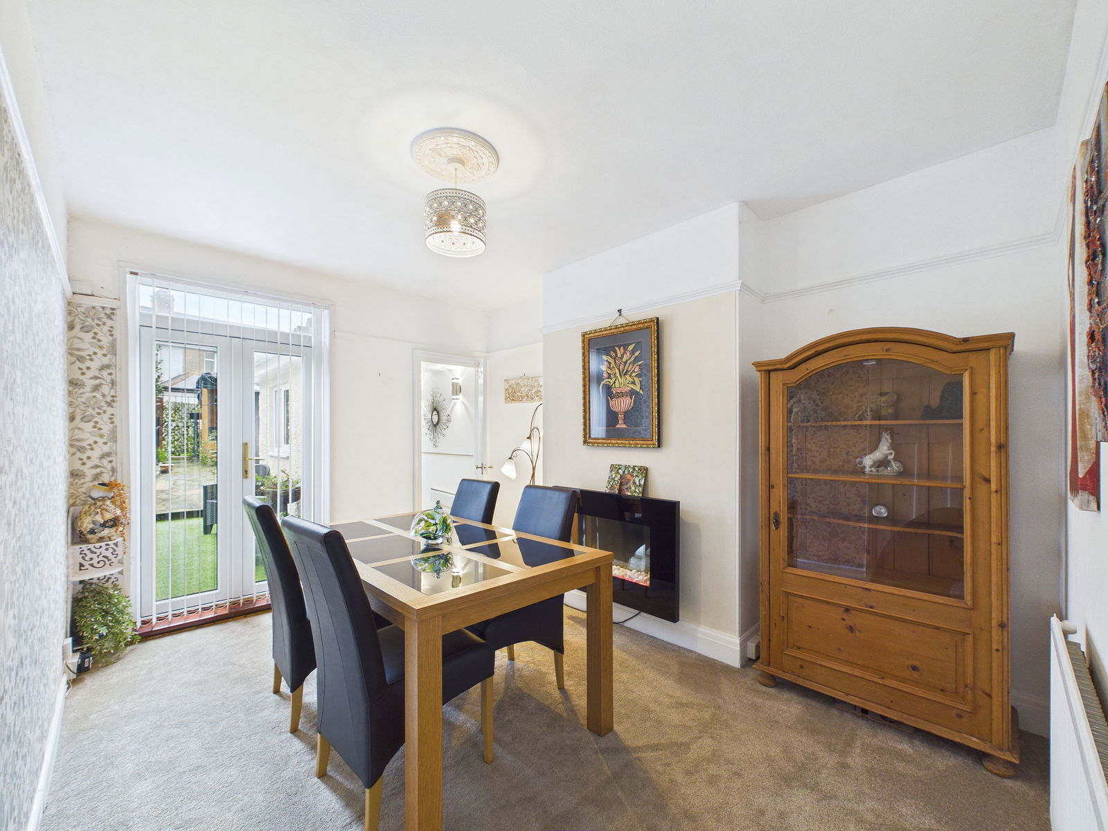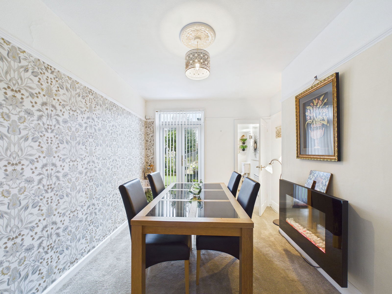DINING ROOM - 3.96m x 2.99m (12'11" x 9'9") A versatile room currently arranged as a a dining room but can be used as a downstairs bedroom for downstairs living. Ample space for a good size family dining table. Picture rails, ceiling rose and carpeted flooring. Double glazed French doors leading out into the rear garden. Door to:-