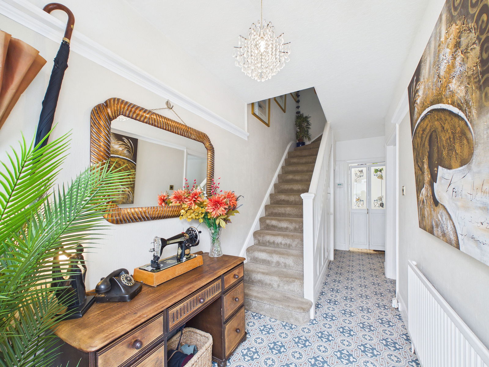 ENTRANCE HALL UPVC double glazed door to the front opening into a bright and welcoming entrance hallway with tile effect flooring. Carpeted flooring leading to the first floor with a traditional wood painted bannister. Radiator. Double glazed frosted window. Storage cupboard under the stairs housing the gas and electric meters along with the consumer unit and handy storage space. Further open storage space under the stairs that can accommodate a fridge/freezer.