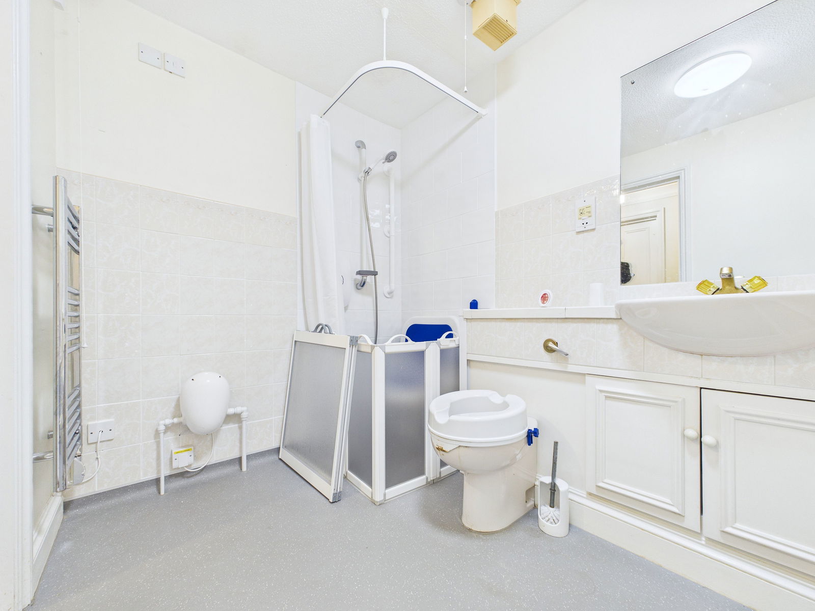 BATHROOM Fitted suite comprising panelled bath and vanity unit with semi recessed wash hand basin with mirror over. Close coupled WC with concealed cistern. Wet room style shower area with electric shower unit. Chrome heated towel rail. Part tiled walls.
