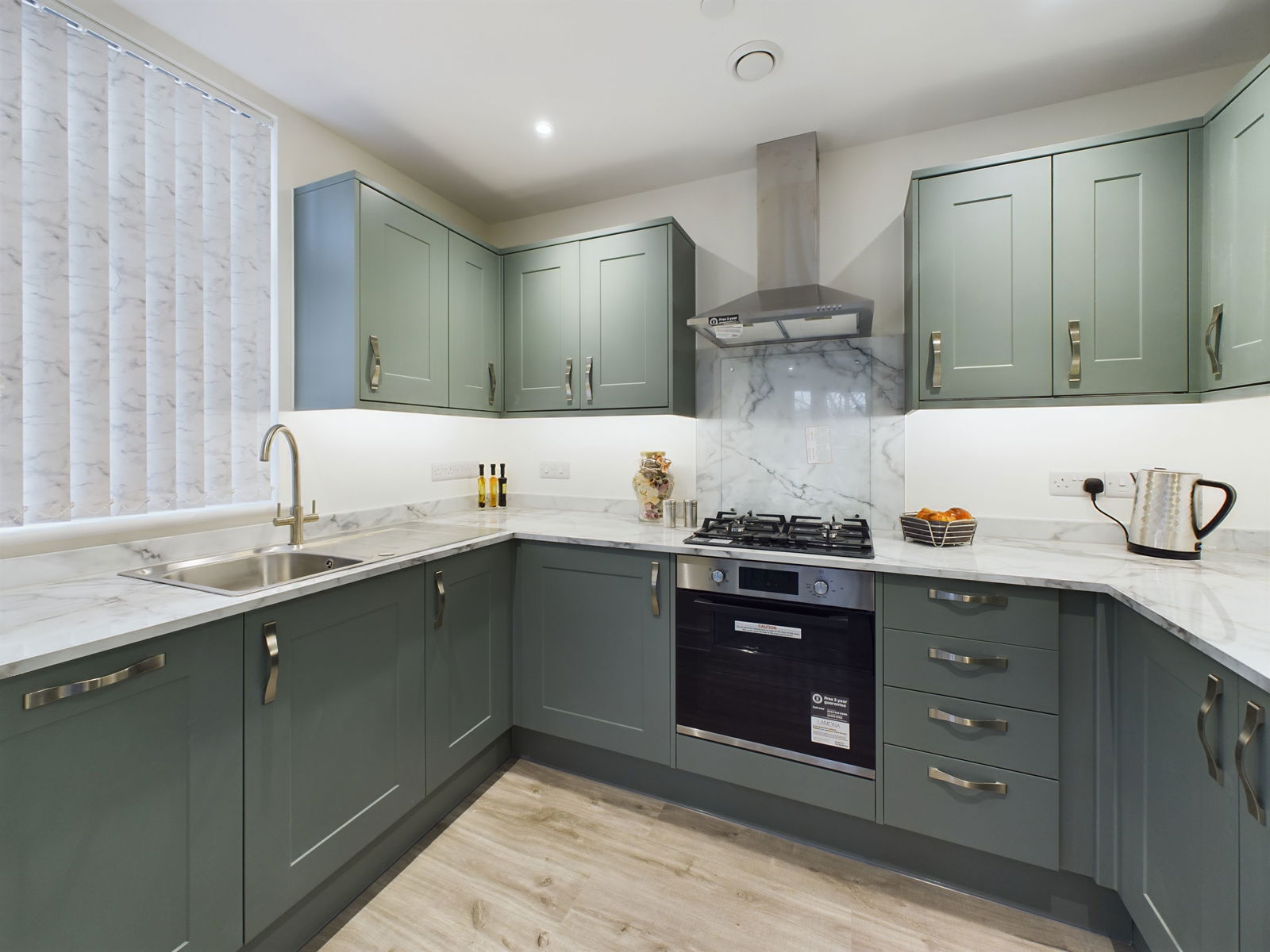 KITCHEN - 3.1m x 2m (10'2" x 6'6") A good sized room fitted with an extensive range of matching wall and base units with contemporary works surfaces over and soft close doors and drawers. Included is a built in oven and hob, integrated dishwasher, stainless steel cooker hood and and integrated fridge /freezer.