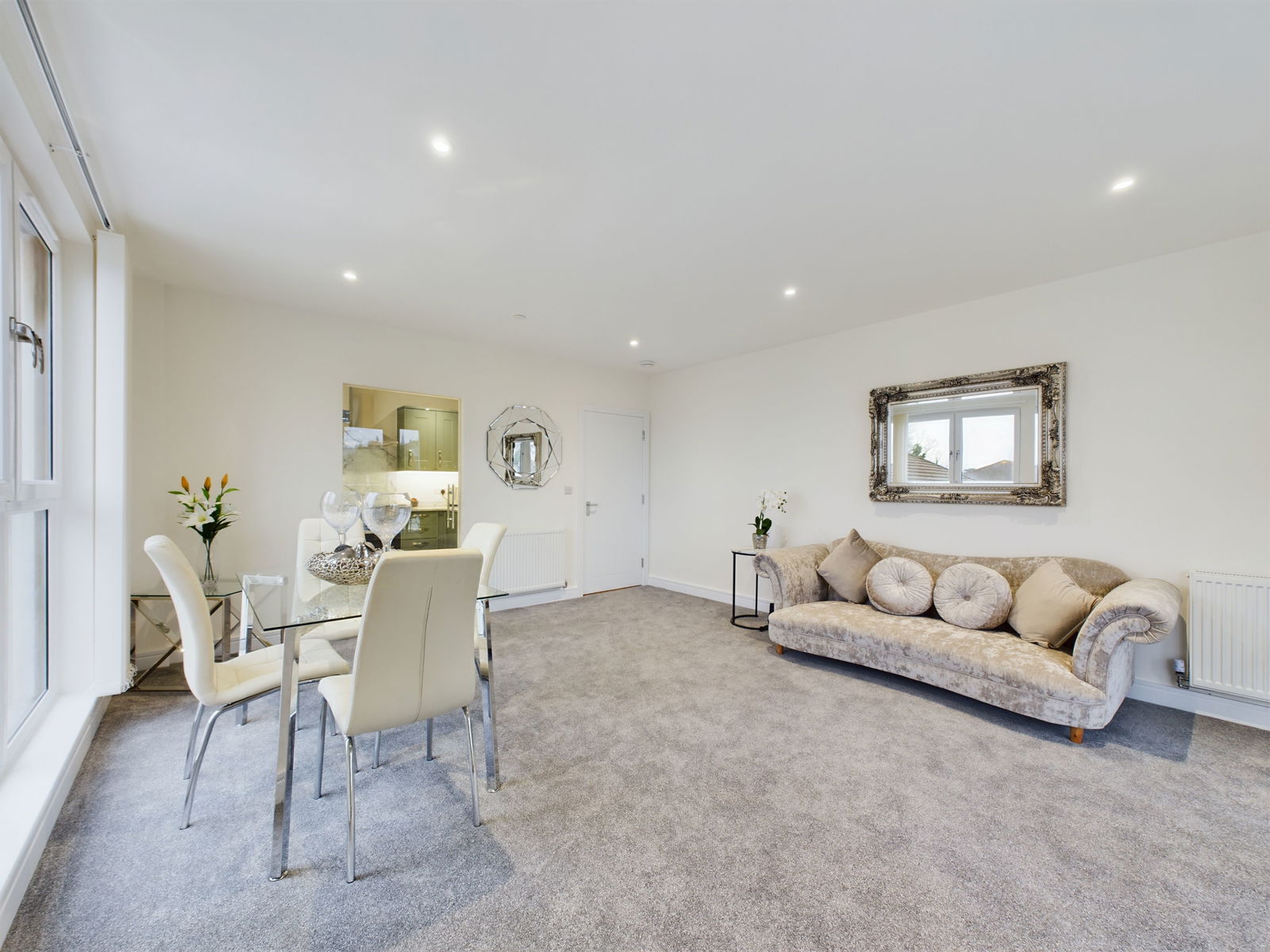 LOUNGE/DINER - 4.3m x 5.4m (14'1" x 17'8") A spacious Lounge/Diner allowing for a cosy lounge area which has double glazed French doors opening on to the SUN TERRACE. There is a dinning area which will easily accommodate a 4-6 seater table and is adjacent to the:-