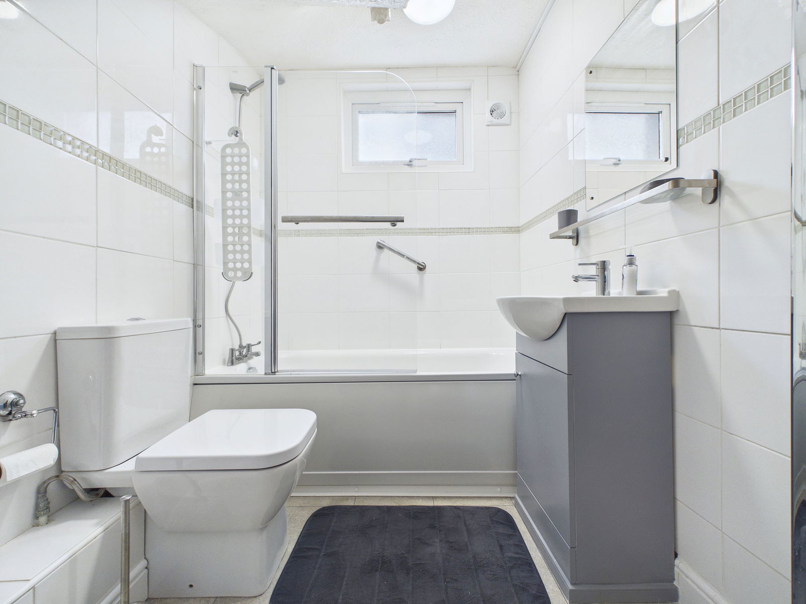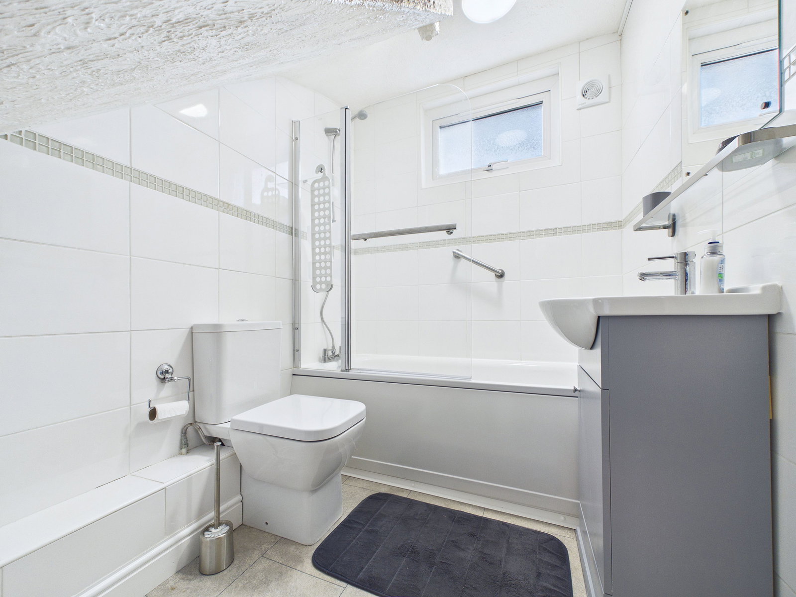 BATHROOM Fitted with a white suite comprising bath with shower attachment and splash screen, vanity unit with semi recessed wash hand basin and mixer tap plus close couple WC with dual flush. Tiling to the walls. Double glazed window. Extractor fan. Useful under stairs store cupboard. Chrome ladder radiator.