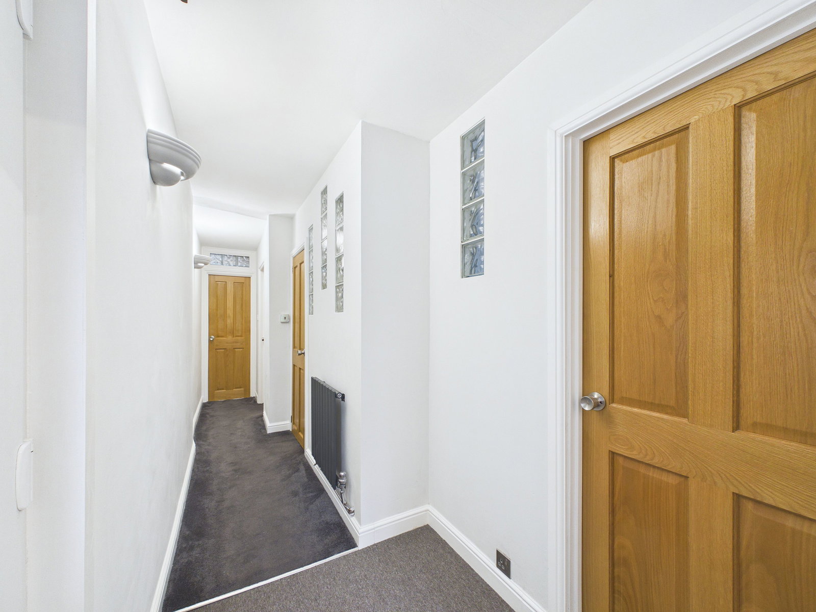 HALLWAY A long hallway with two wall light points. Modern radiator. Built-in coat cupboard/storage. Cupboard housing electric meter and fuse box. Digital thermostat for central heating.