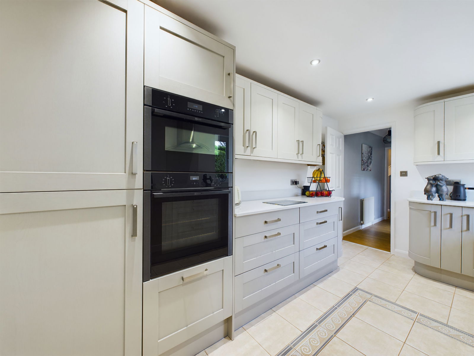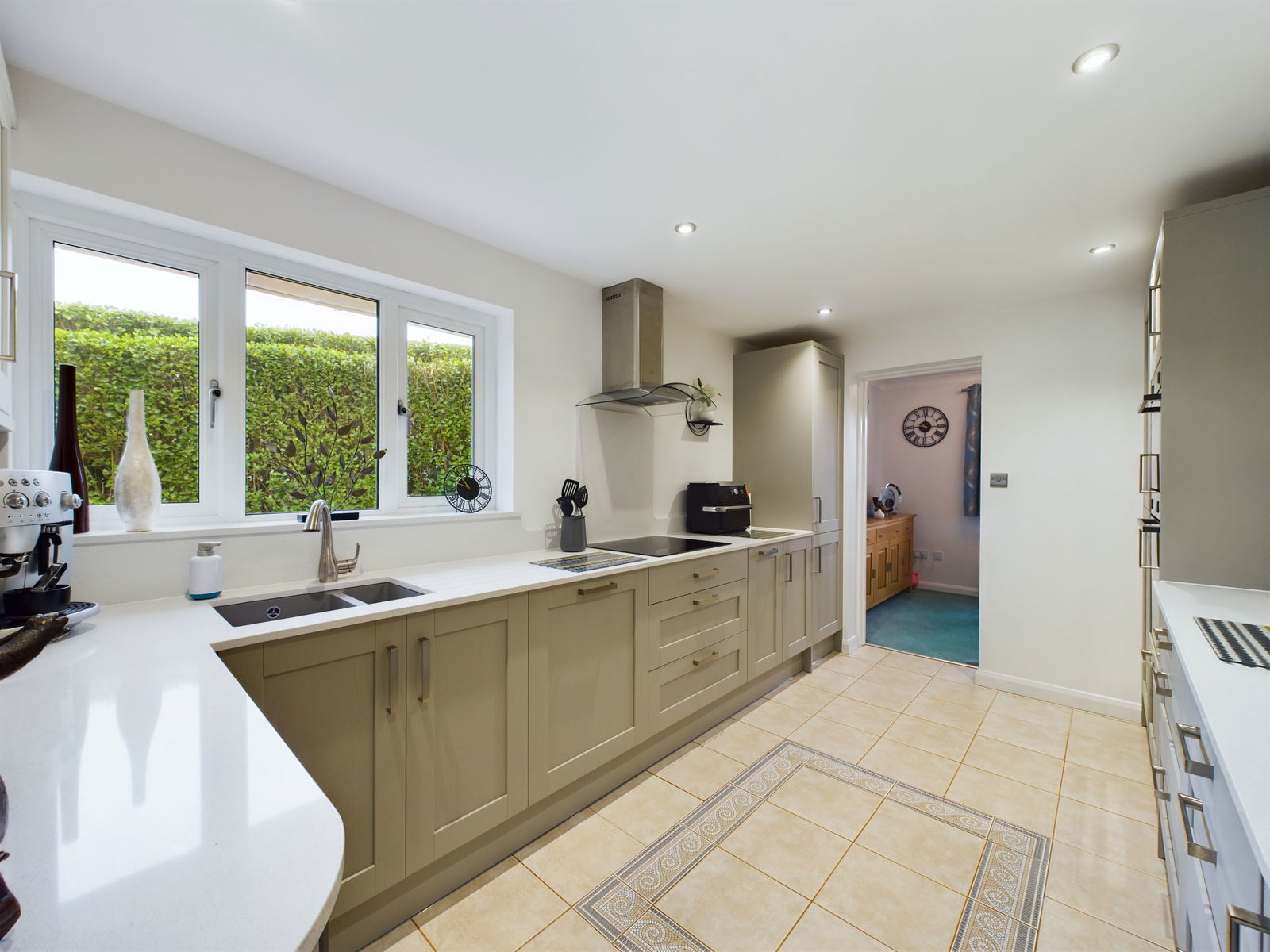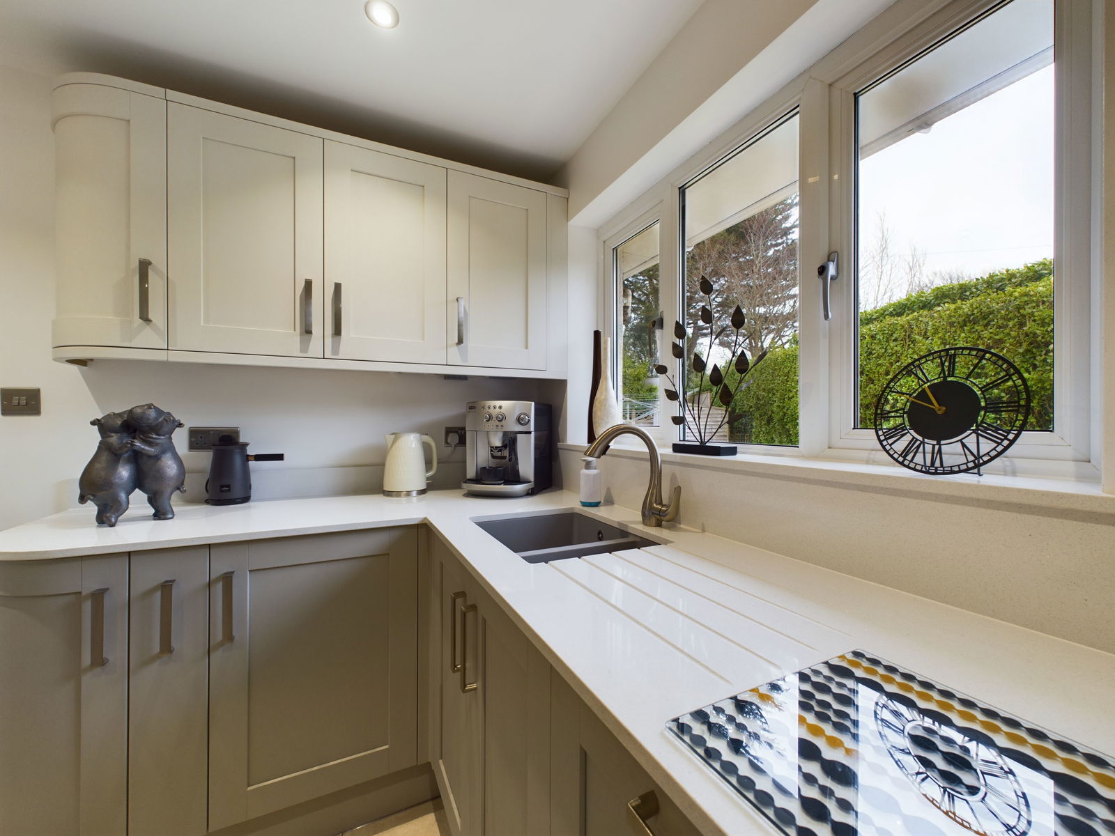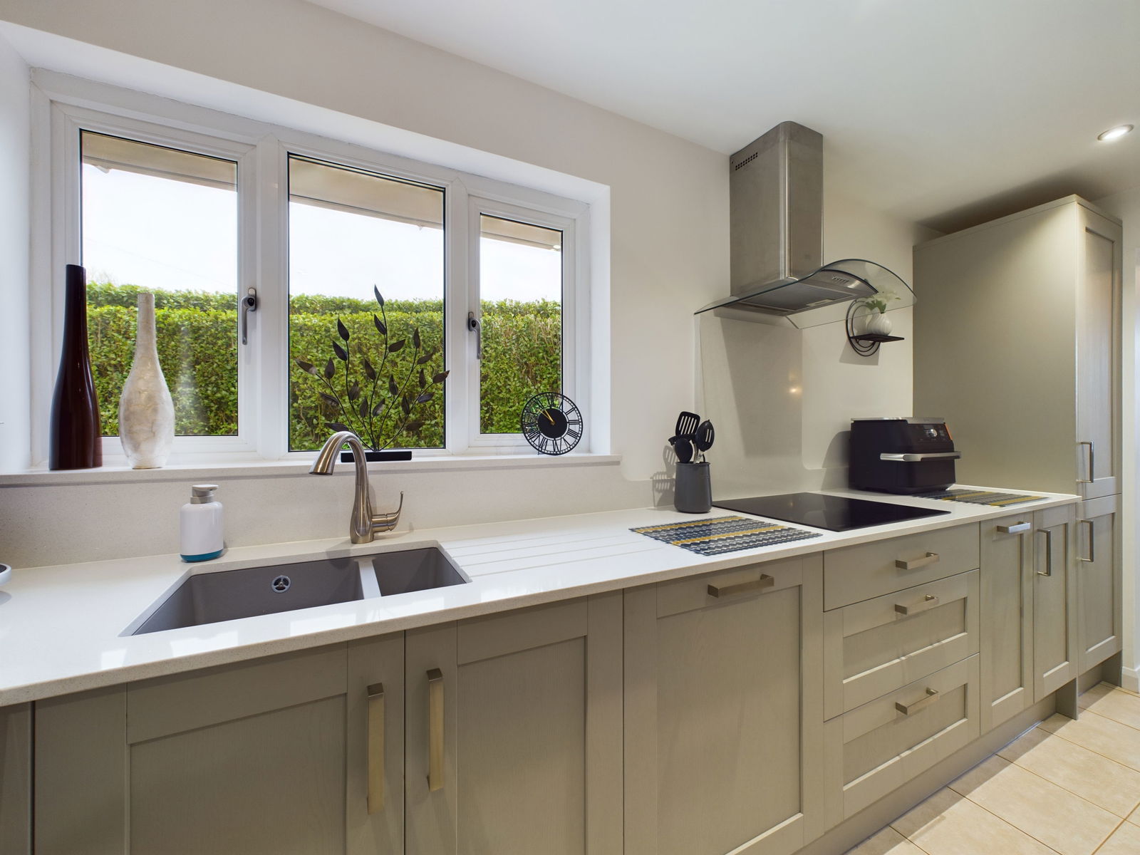 KITCHEN - 13' 8'' x 8' 10'' (4.16m x 2.69m) (Leading onto Dining room/Snug) Stunning Howdens light grain newly fitted kitchen comprising double bowl sink unit with quartz work tops with splashbacks and scoloped turns. Comprehensive range of wall and matching base units and a larder with pull out units. Concealed appliances including fridge/freezer/dishwasher and integrated NEFF double oven, hob and microwave. Electric hob and extractor over. Views over gardens, uPVC double glazing and opening onto:-