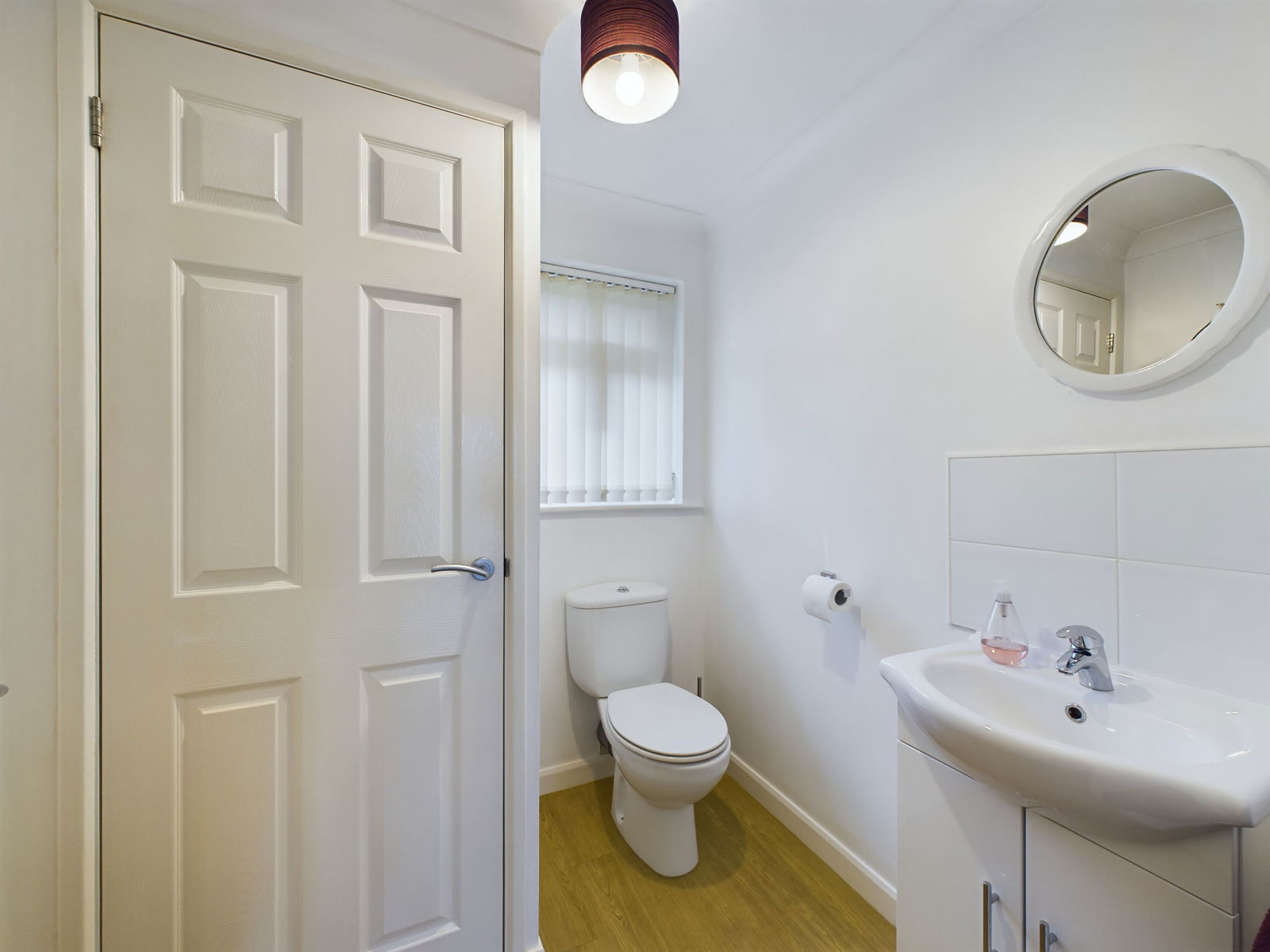 CLOAKROOM/W.C White close coupled WC. Vanity cupboard with inset wash basin. Airing cupboard housing 'Baxi' combination boiler.