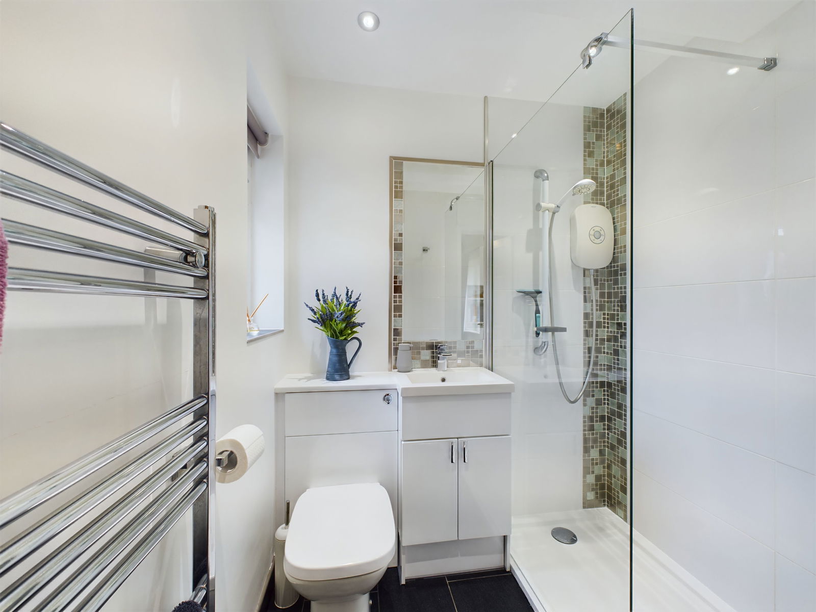 SHOWER ROOM/W.C Walk-in double size shower. White vanity unit with concealed flush WC and inset wash basin. Smart tiled surrounds. Heated towel rail. Extractor fan. Double glazed window.