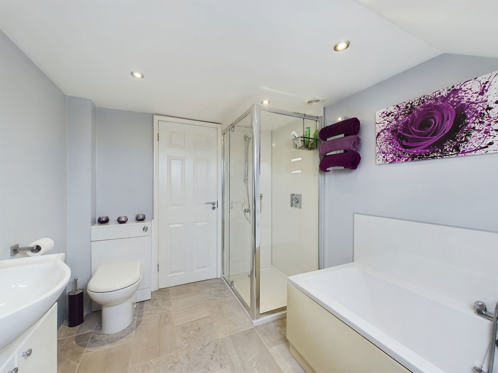 FAMILY BATHROOM/WC Comprising white suite of panelled bath, concealed flush WC and vanity unit with inset wash basin and fitted mirror over with Mosaic tiled feature. Shower enclosure. Heated towel rail. Velux window with fitted blind.