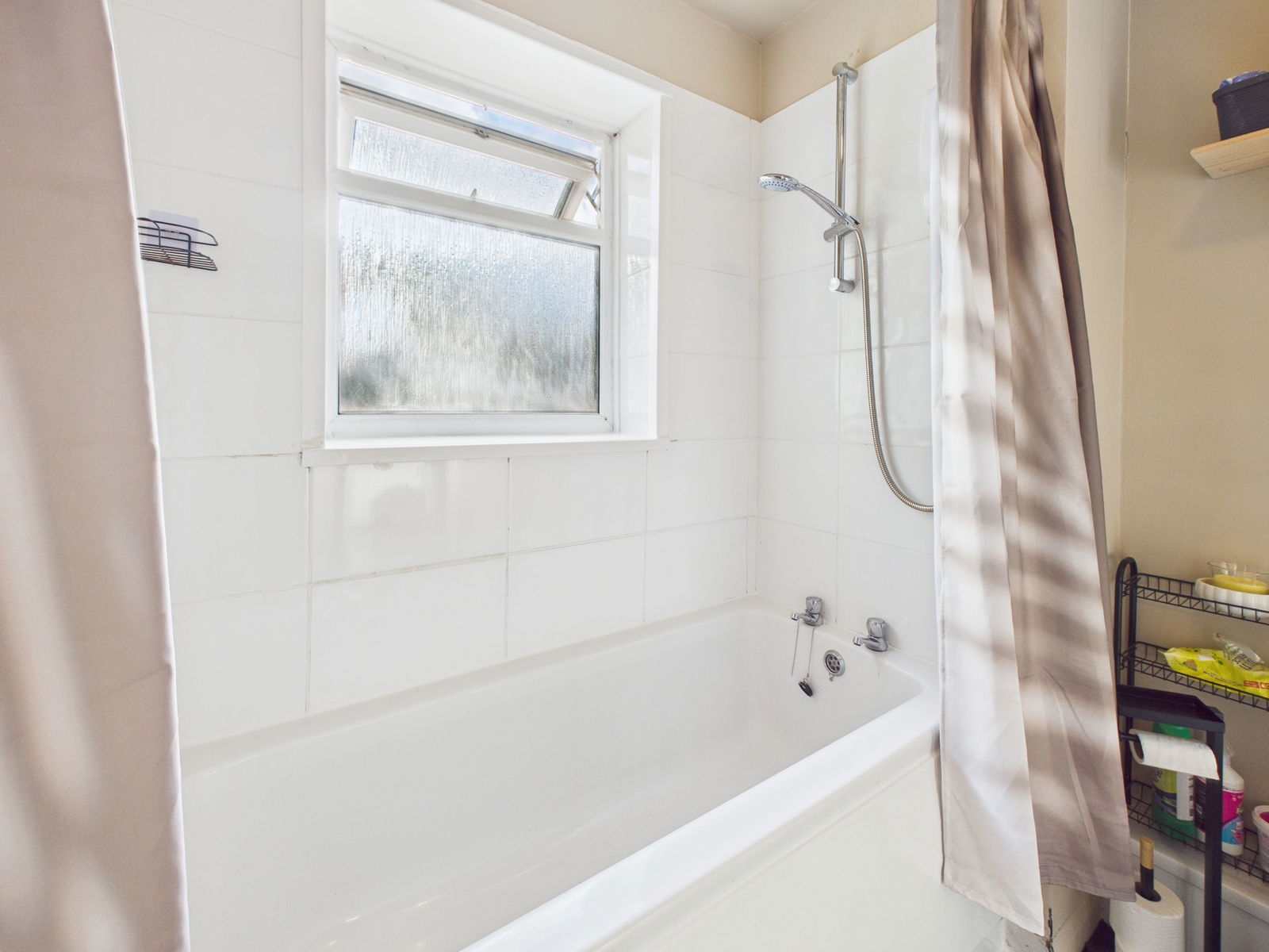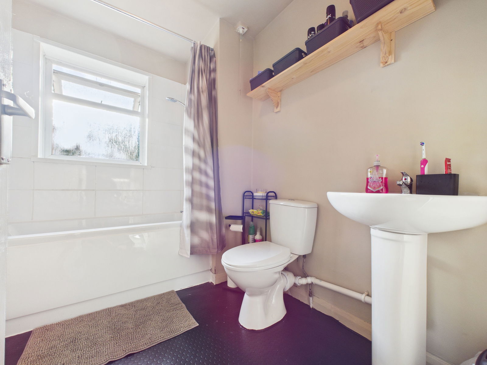 BATHROOM A spacious family bathroom comprising a panelled bath with shower attachment above, pedestal wash hand basin and low level flush WC. Finished with part tiled walls, a uPVC obscure double glazed window and a gas central heating radiator.
