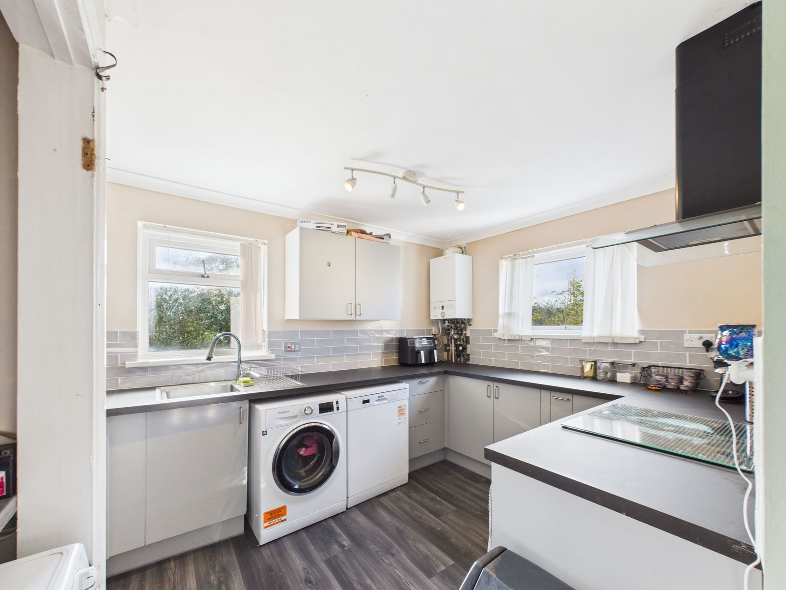 KITCHEN A contemporary fitted kitchen featuring a range of wall, base and drawer units with roll edged work surfaces. The space includes a 1 bowl stainless steel sink and drainer, an electric oven and induction hob with extractor above, and space for a washing machine, dishwasher, dryer and fridge freezer. With a complementary tiled backsplash and double aspect uPVC double glazed windows.