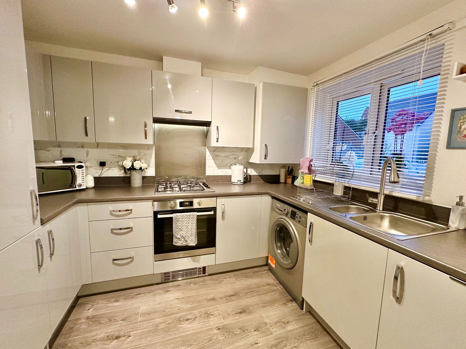 Fitted with a range of white wall and bane units with built in gas hob and electric oven/grill. Plumbing for washing machine. Appliance space. Double glazed windows. Cooker hood.