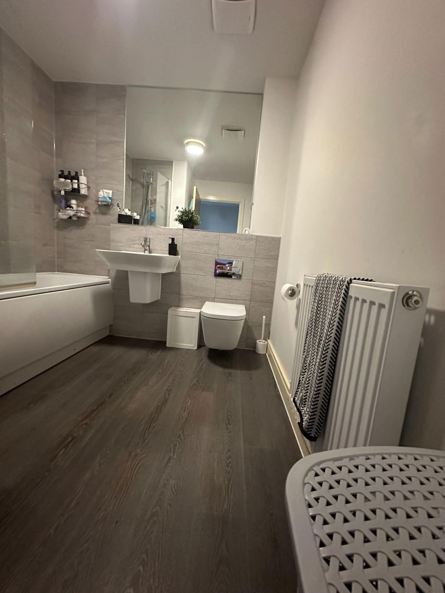 A family bathroom fitted units a modern white suite comp bath with shower over. Wash hand basin and WC with dual flush