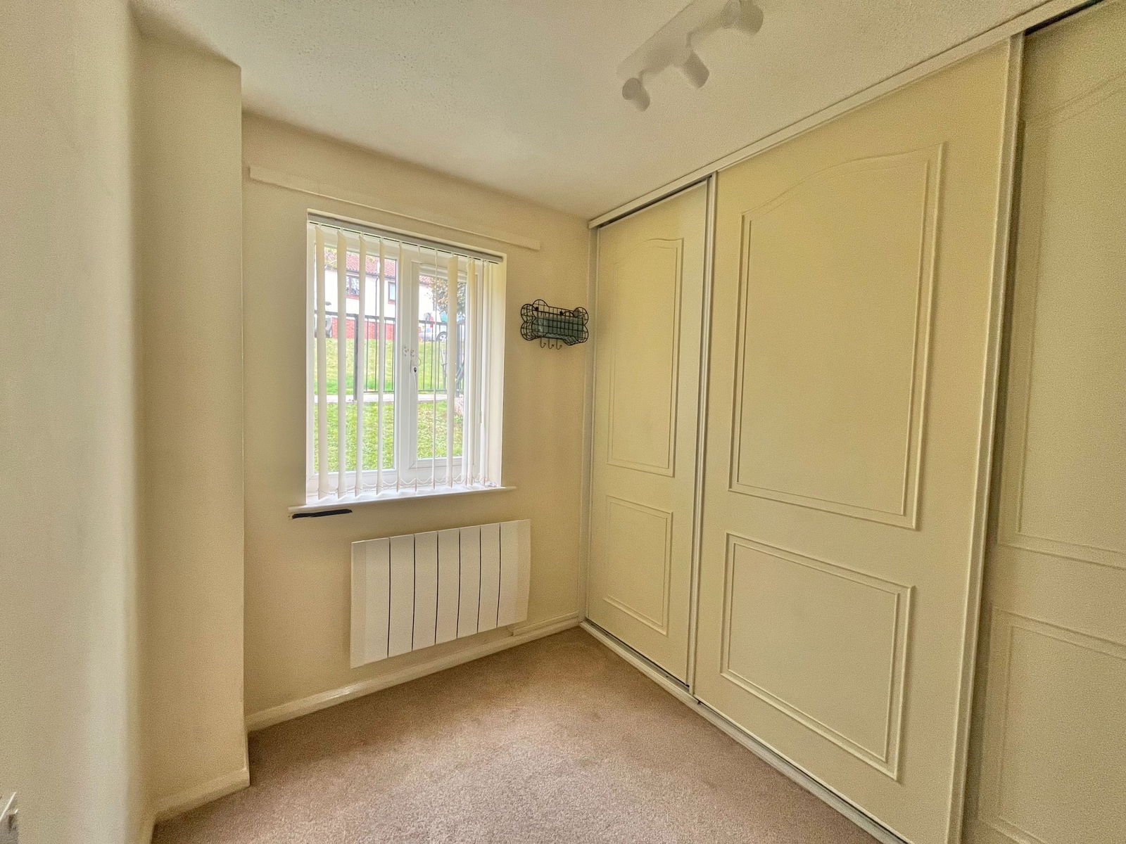 BEDROOM Individual made shutters. Built in wardrobes. Matching dresser. Electric panel heater.