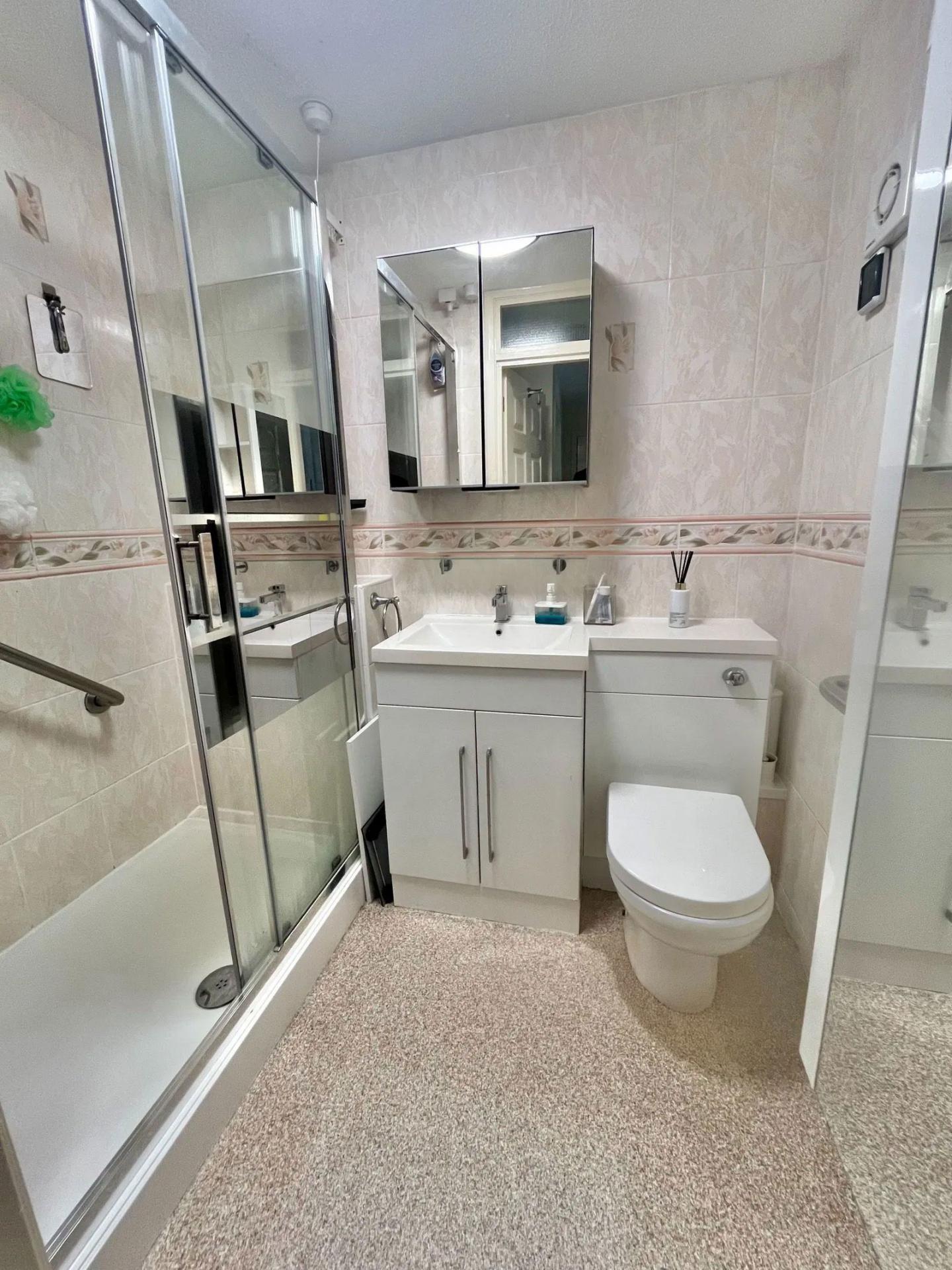 BATHROOM Refitted suite with feature wash basin and close coupled WC. Double shower cubicle with electric shower, extractor fan and fully tiled.
