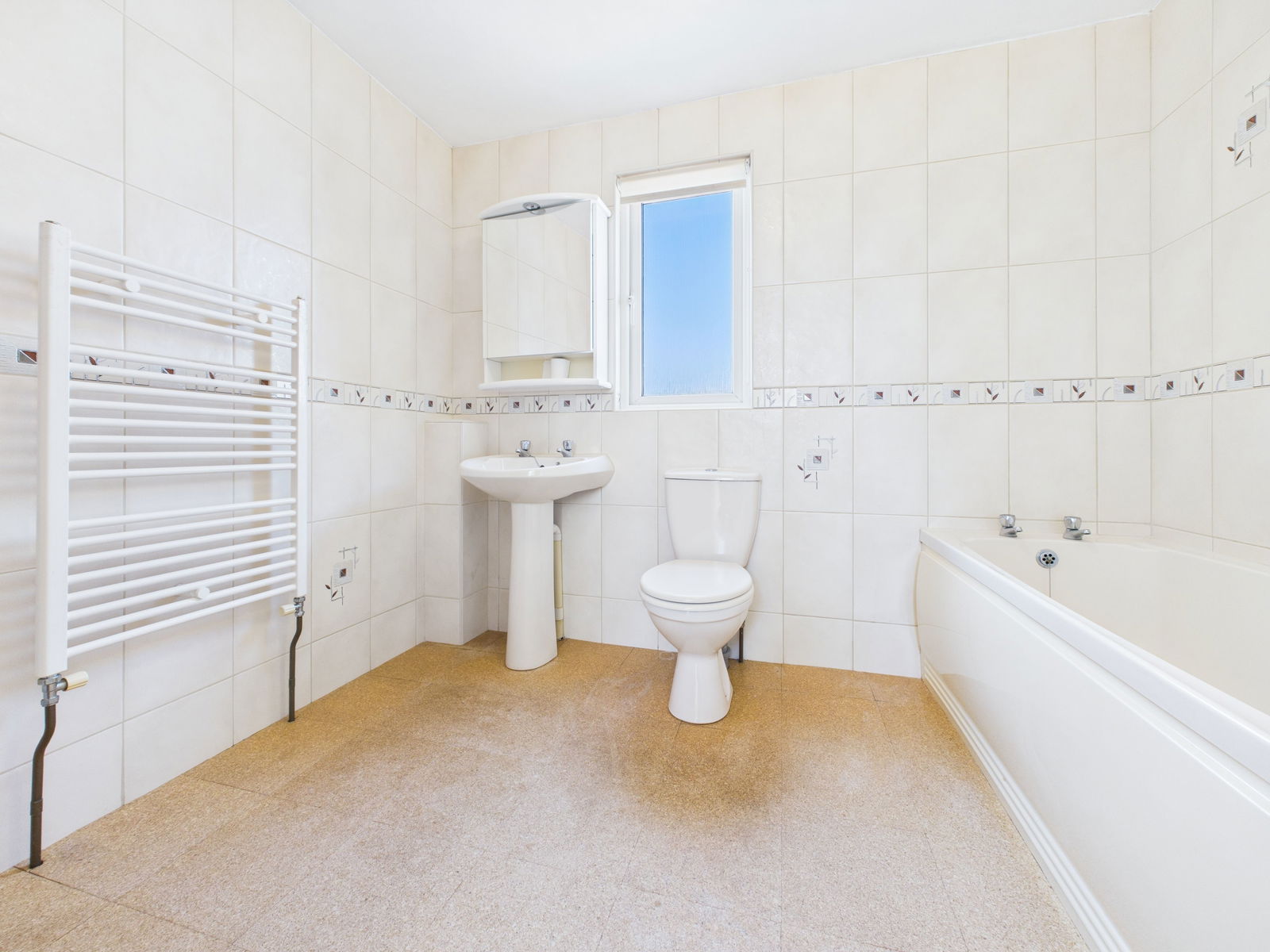 BATHROOM Featuring a three-piece suite including a panelled bath, pedestal wash hand basin, and low-level WC, complemented by tiled walls, a white heated towel rail and obscured double glazed window.