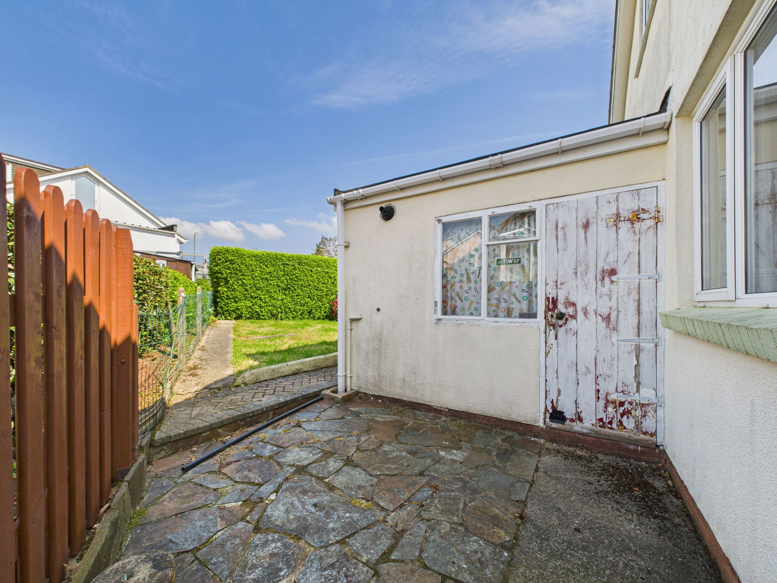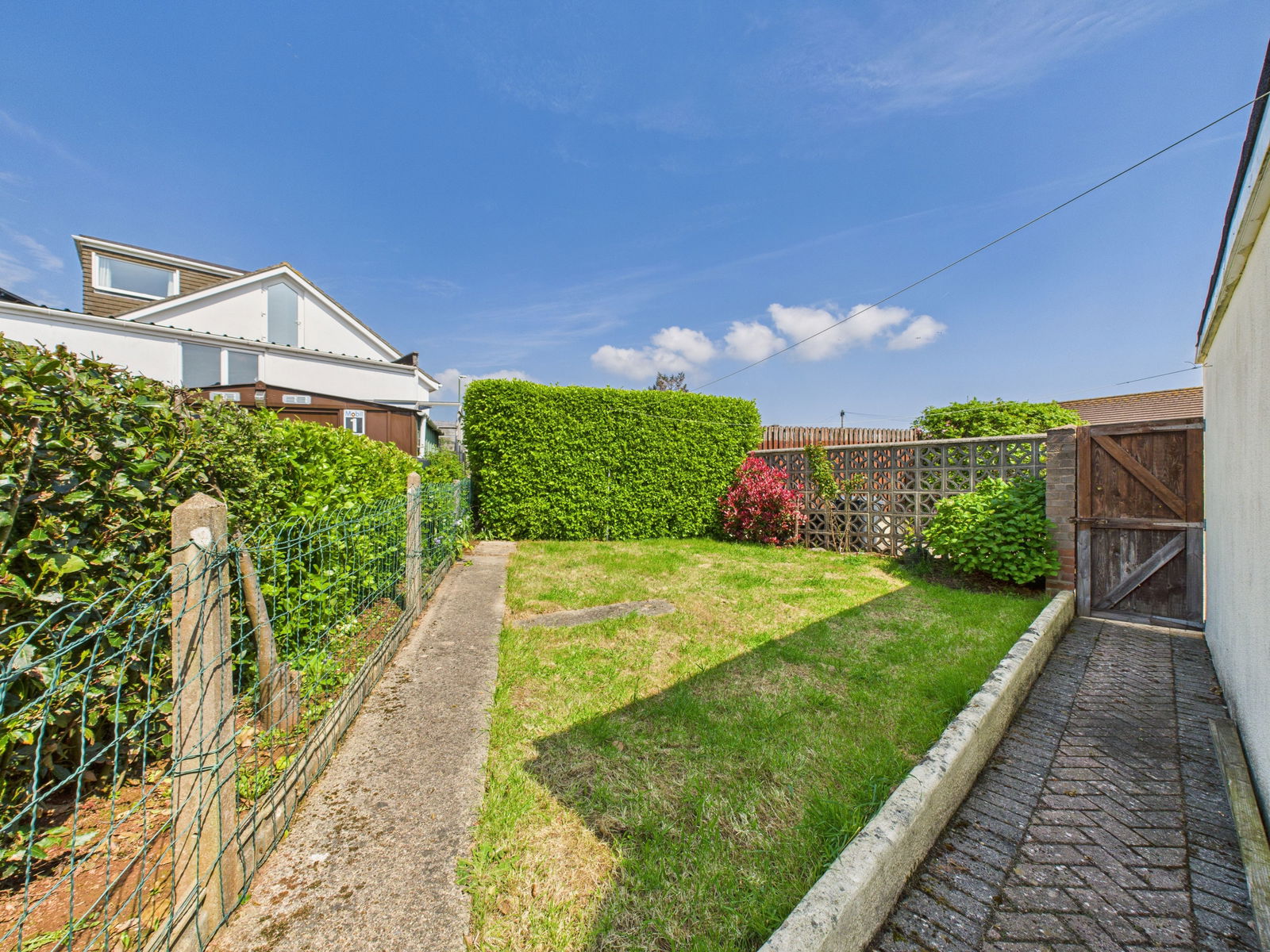 OUTSIDE Beautifully maintained wraparound gardens with a spacious lawn to the side of the property bordered by mature shrubs and hedges, plus a paved patio area perfect for alfresco dining or evening drinks, as well as a further lawned area to the other side of the home. Additional features include a block-built storage cupboard, garage access, and gate to the driveway.