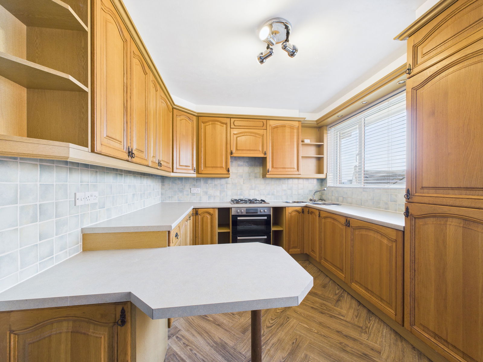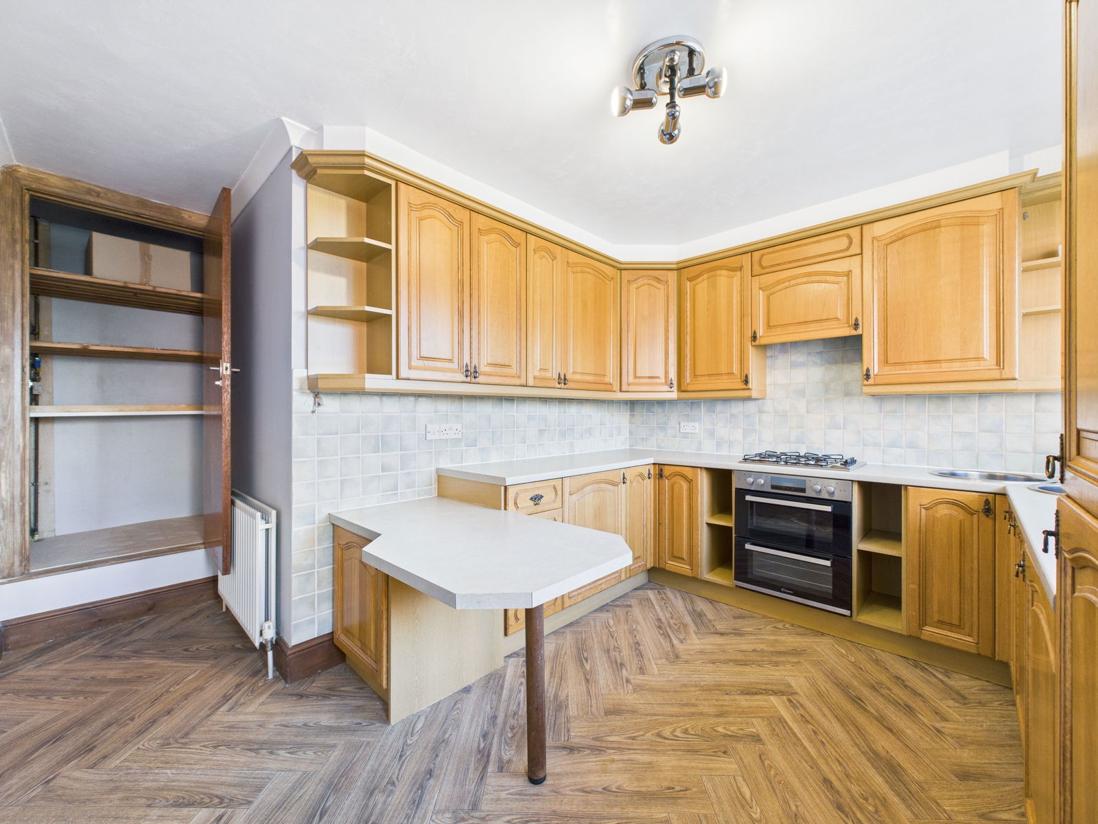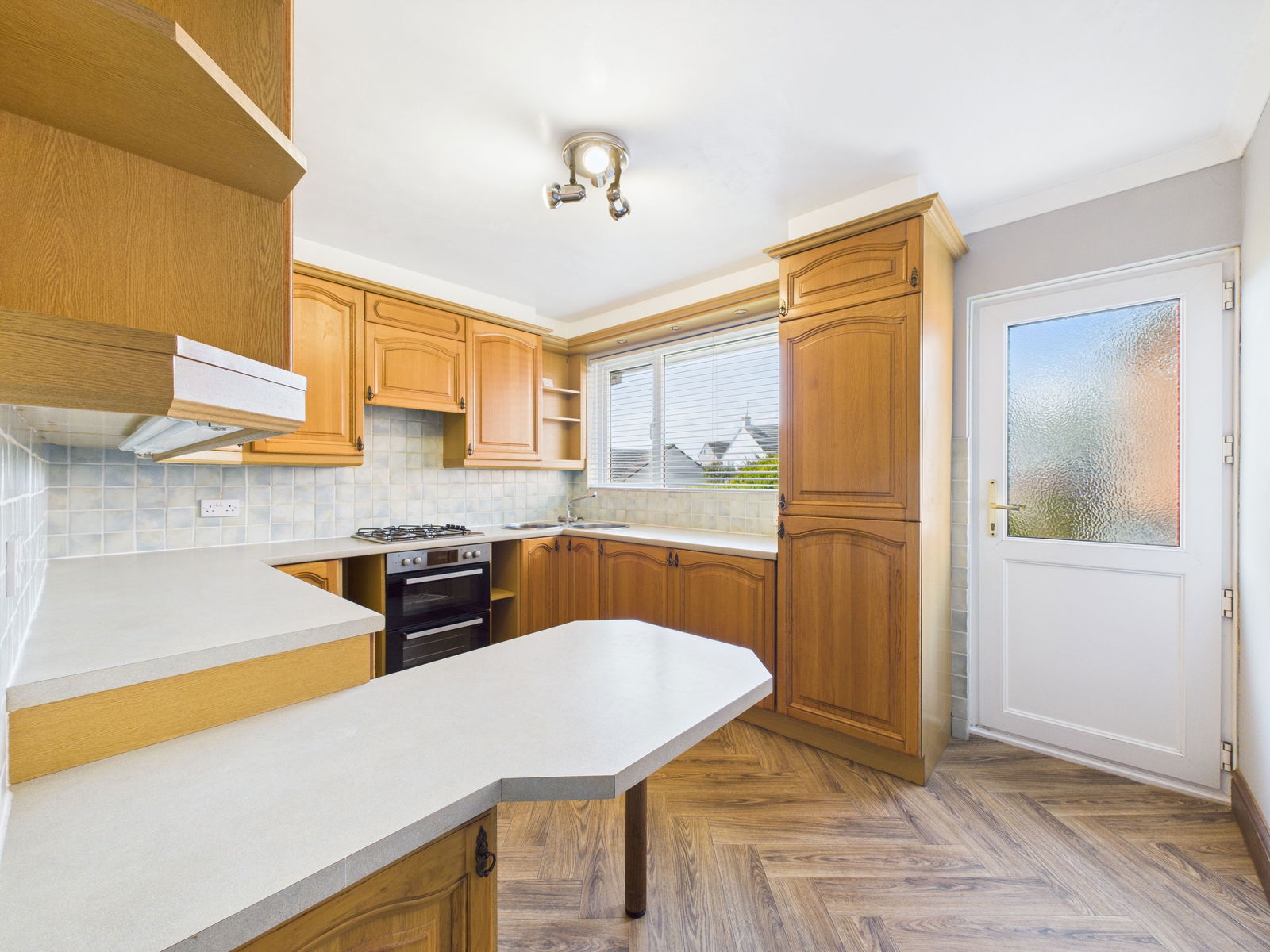 KITCHEN This generously proportioned kitchen is fully equipped with a range of overhead, base and drawer units complemented by roll-edged worktops and tiled splash backs. Integrated appliances include an electric oven with grill, four-ring gas hob with extractor hood above, washing machine, and fridge freezer. A two-bowl stainless steel sink and deep pantry cupboard offer practicality, and a uPVC double glazed window and door leading to the gardens.