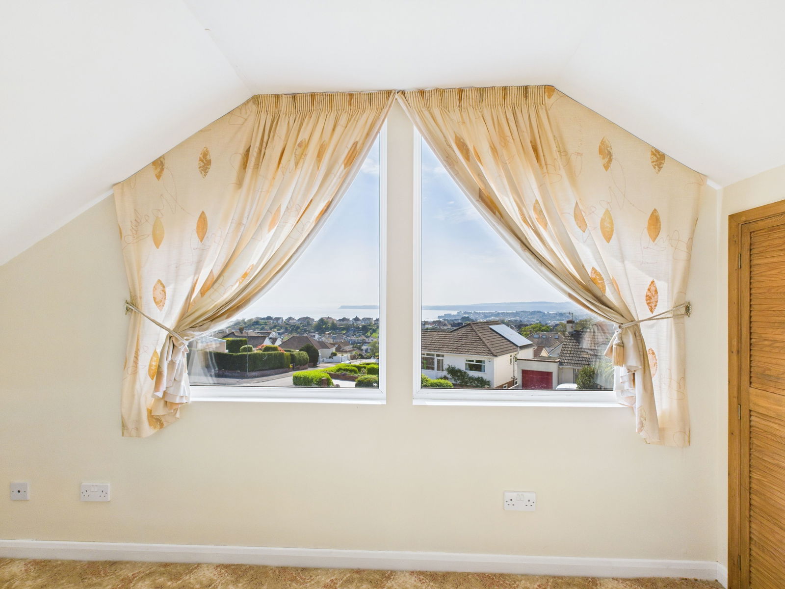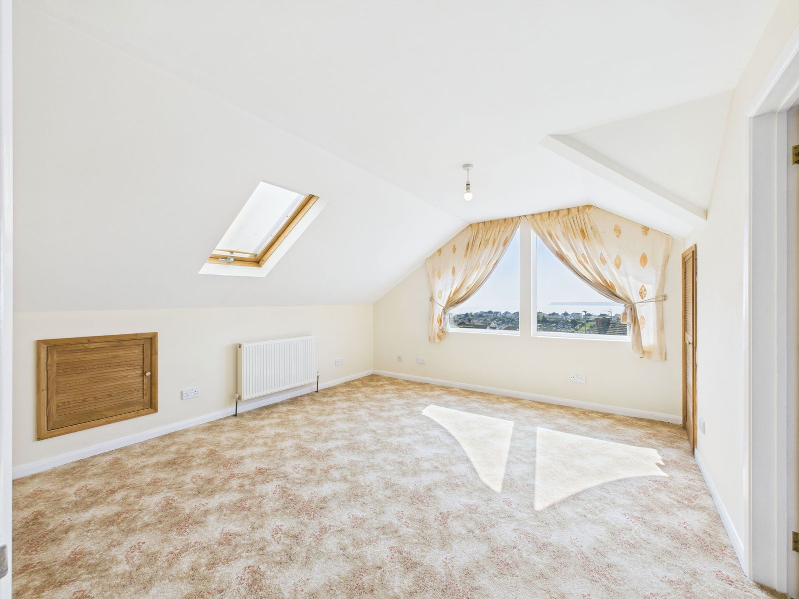 BEDROOM ONE An exceptionally large master bedroom offers spectacular sea views across the bay and abundance of space for furnishings. eaves storage, a gas central heated radiator and uPVC windows, door leading into.