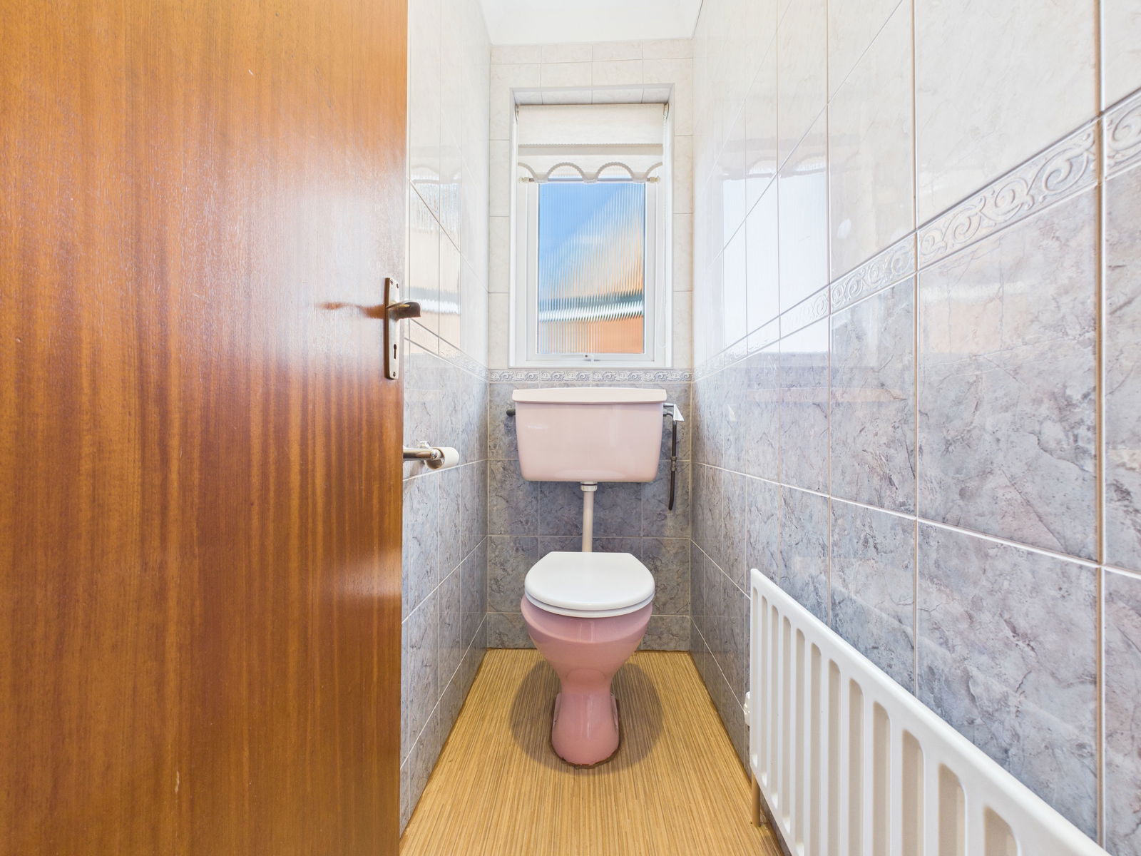 CLOAKROOM Conveniently located on the ground floor, this cloakroom features a low-level flush WC, tiled walls, and an obscured uPVC double glazed window.