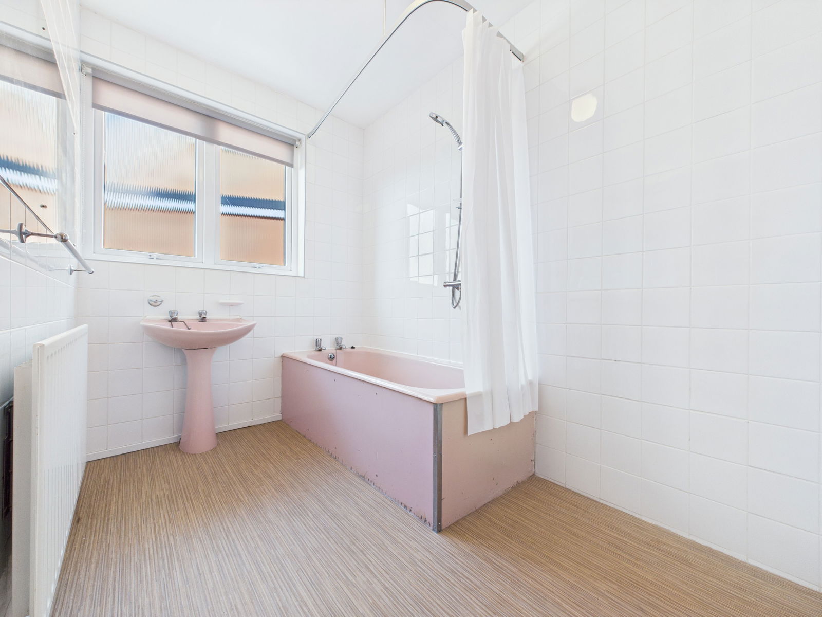 FAMILY BATHROOM A well-sized bathroom with a panelled bath with shower attachment above, a pedestal wash basin, a gas central heated radiator, tiled walls, and a uPVC double glazed obscure window.