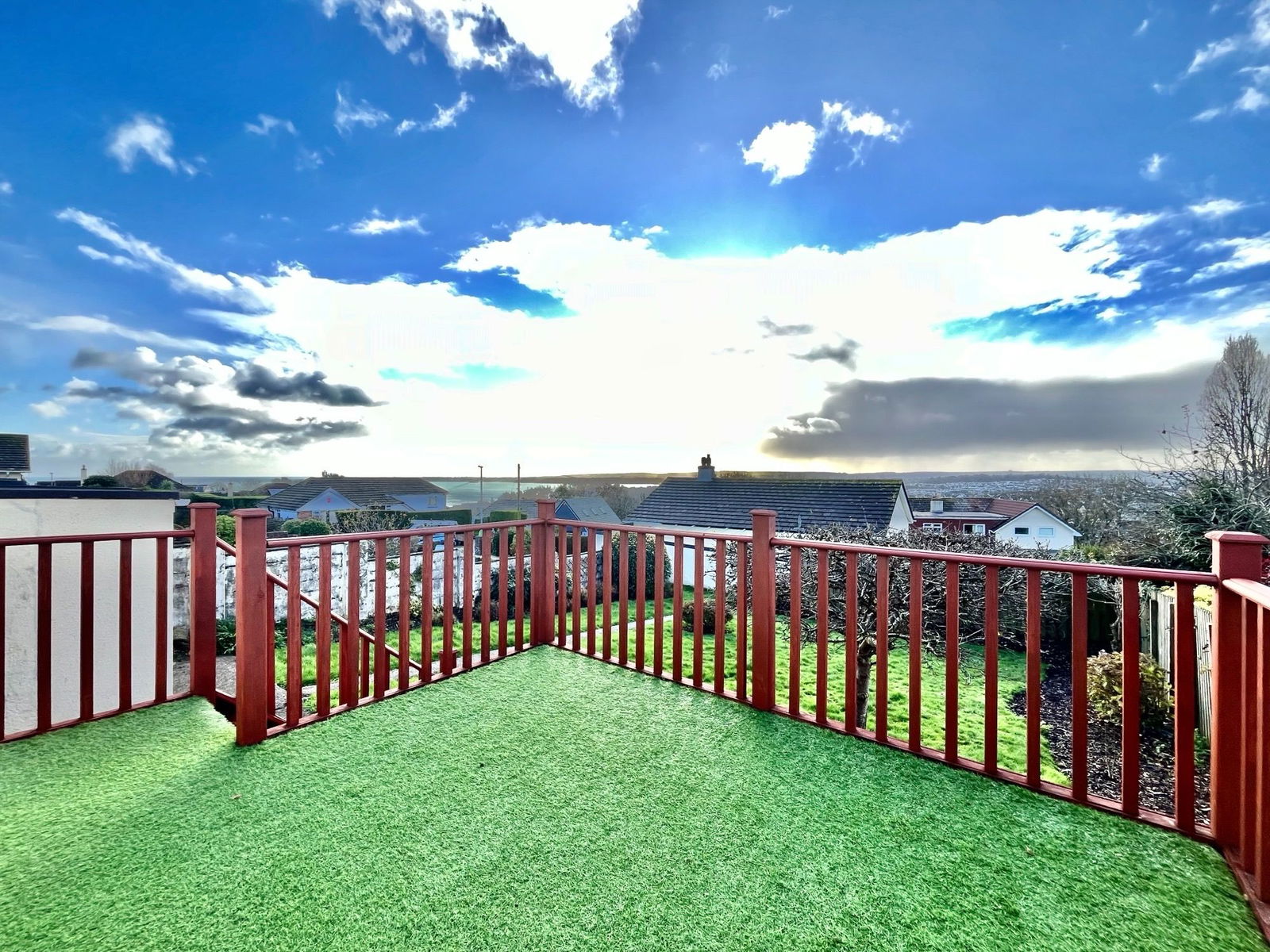 REAR GARDEN A south facing, enclosed rear garden that boasts wonderful sea views across to Berry head, Brixham. The gardens have been divided into two sections with a raised sun deck off of the living room perfect for outdoor dining and entertaining whilst taking in the spectacular views, whilst steps then lead to the rest of the gardens that are predominantly laid to lawn with a concrete patio area also. Side gate access leading to the driveway, under house storage as well as further storage under the sun deck and water tap.