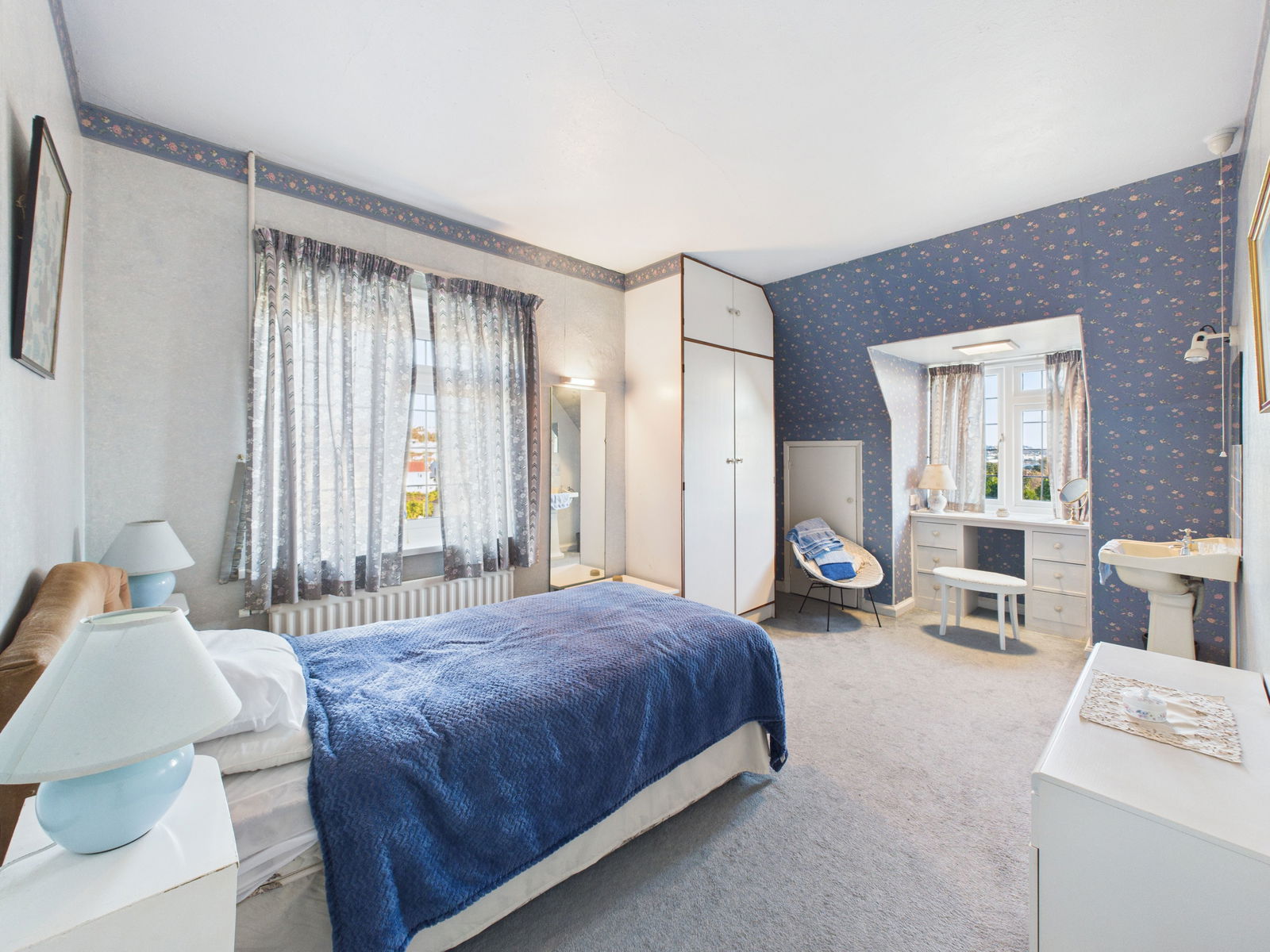 BEDROOM TWO Double aspect room again taking in beautiful sea and town views. Central heating radiator. Pedestal wash basin, eaves storage and built in vanity desk.
