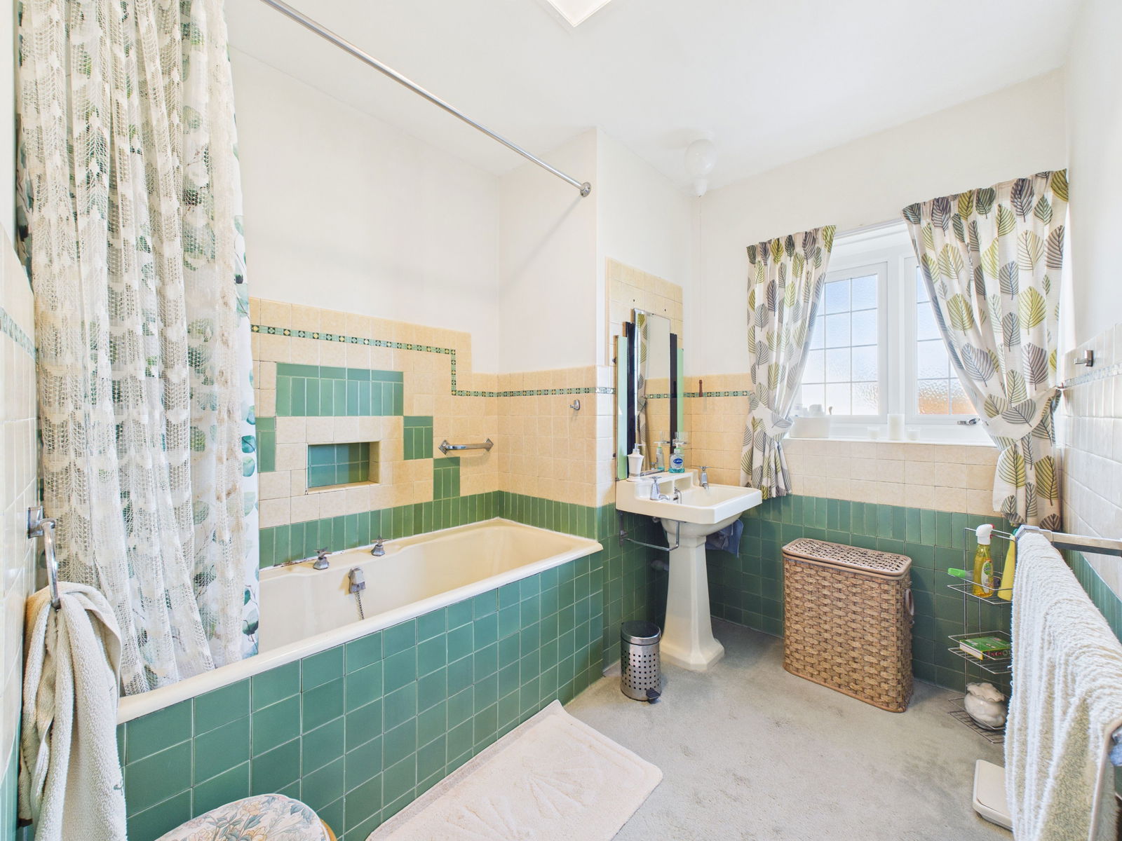 BATHROOM Most attractive 1930's bathroom suite with central bath with inset taps, shower, pedestal wash basin, half tiled, chrome heated towel rail and uPVC double glazing.
