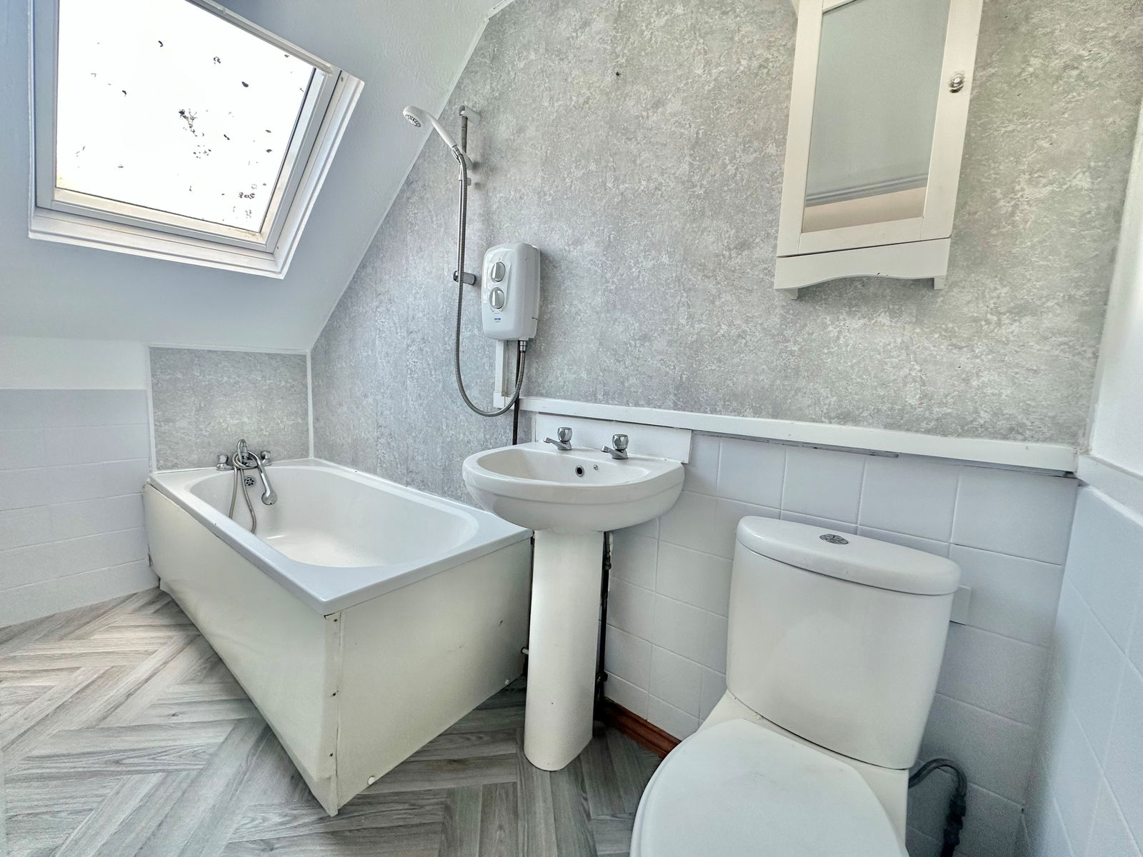 BATHROOM – 1.17m x 2.95m (3'10" x 9'8") Fitted with a bath and electric shower, pedestal wash hand basin, and low-level WC. There’s a skylight for natural light and ventilation, part-tiled walls, Lino flooring.