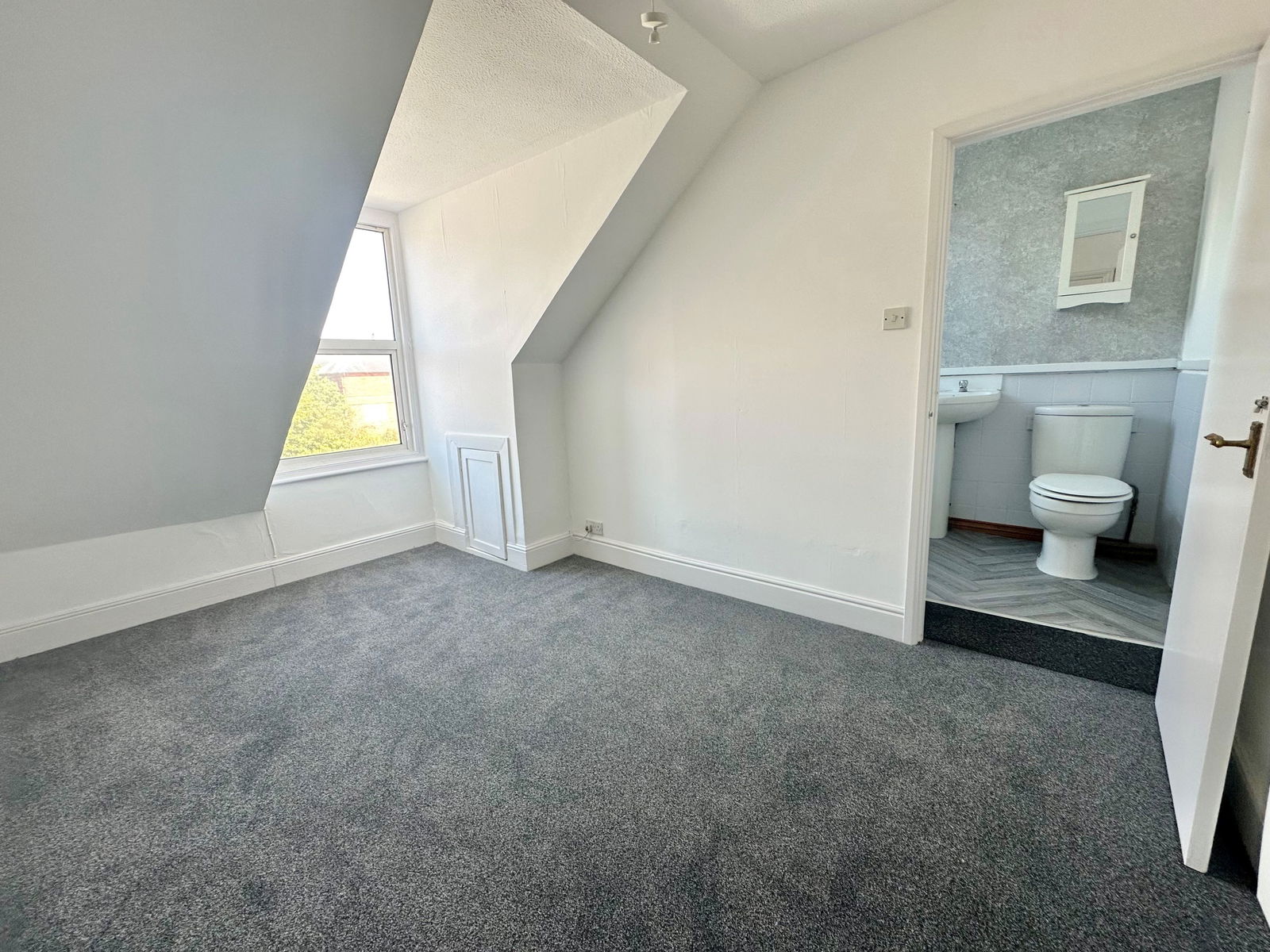 BEDROOM – 2.55m x 4.01m (8'4" x 13'1") at widest points (sloped ceiling): A generous double bedroom with uPVC double glazed window to the rear, looking toward Christ Church. Includes a built-in storage cupboard housing the water meter and a night storage heater.