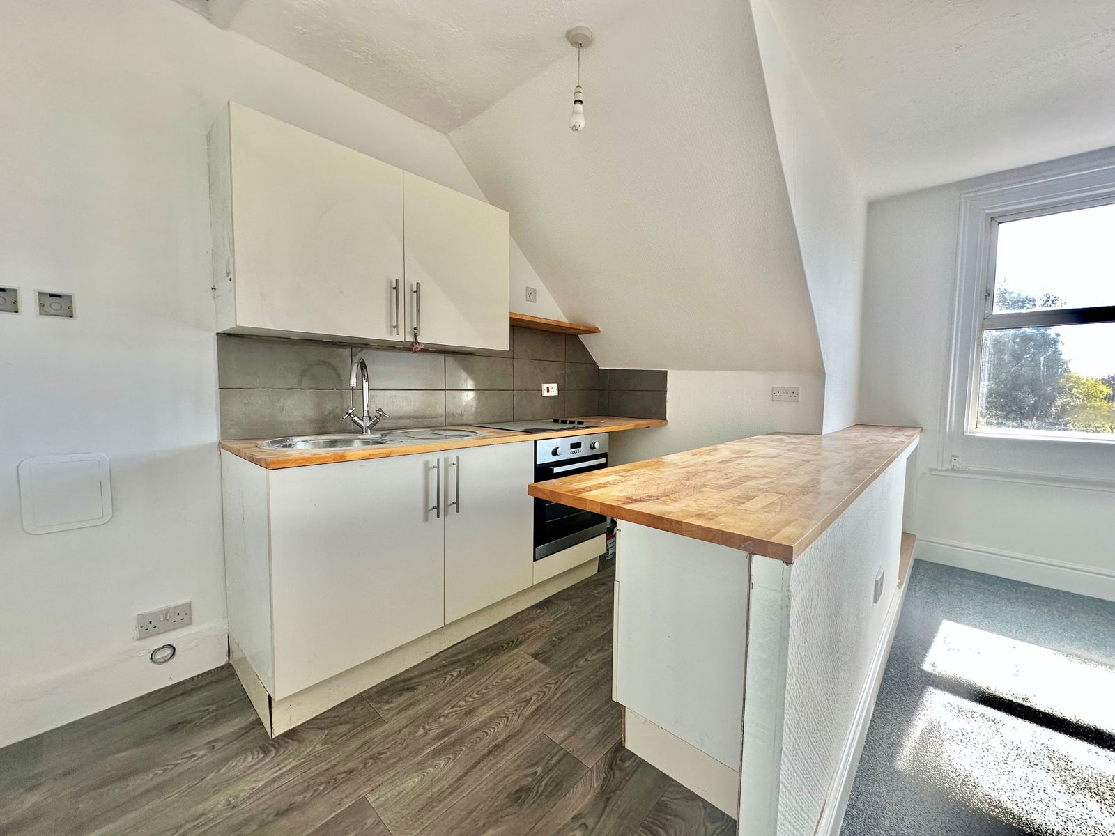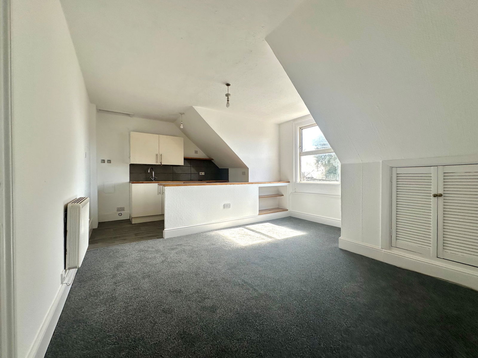 LIVING ROOM/KITCHEN – 5.66m x 4.09m (18'6" x 13'5") at widest points: A bright, open-plan space with a double glazed window offering views over Courtland Road and Victoria Park. The lounge area includes a TV point, eaves storage, and night storage heating. A peninsular unit separates the lounge from the kitchen.