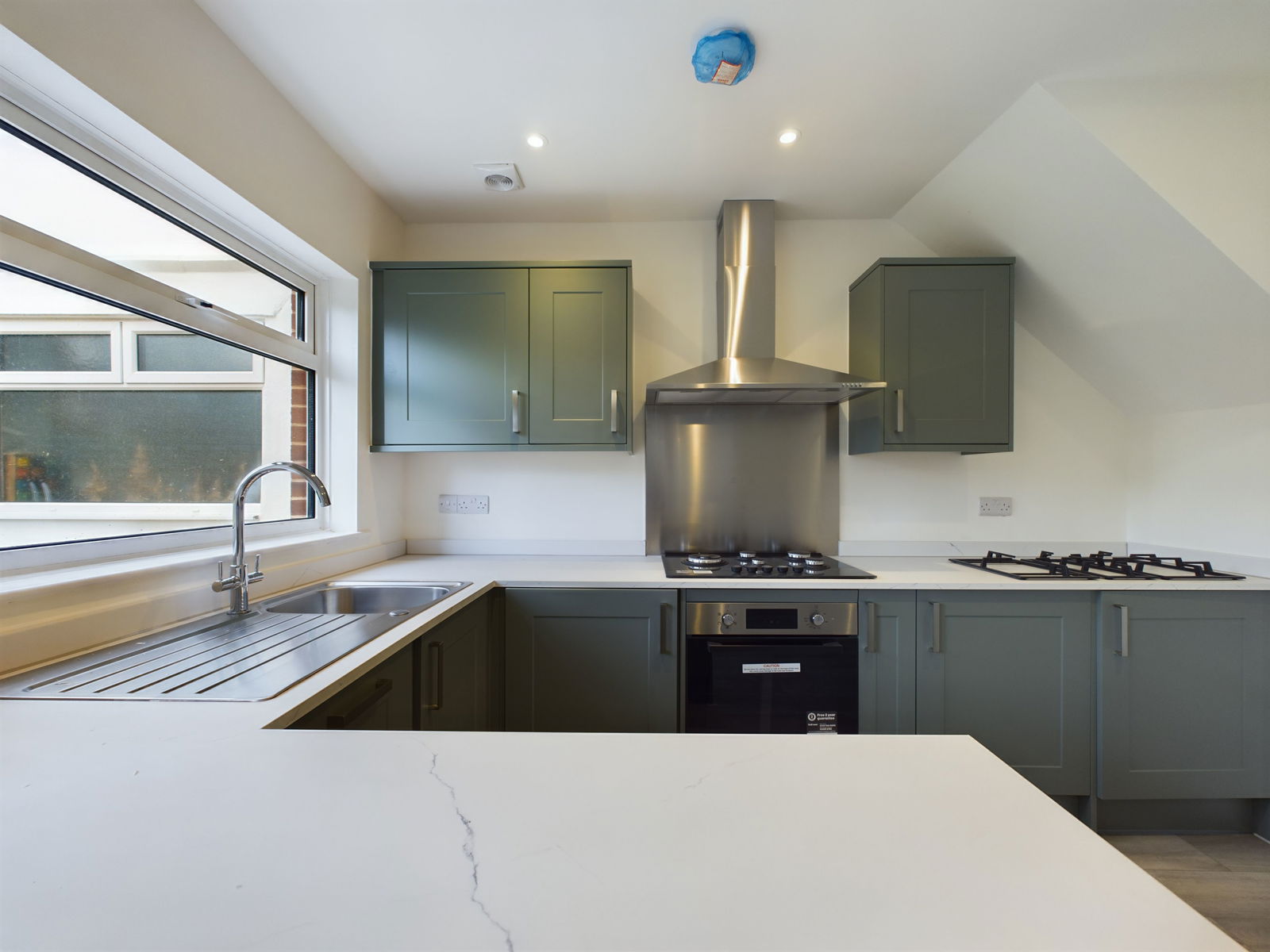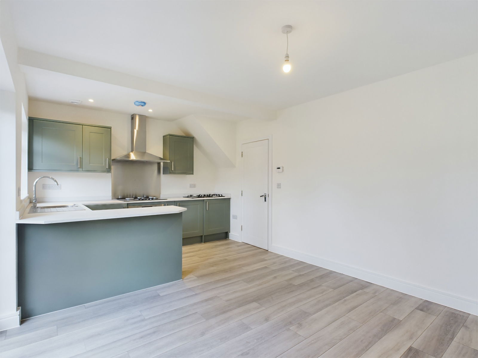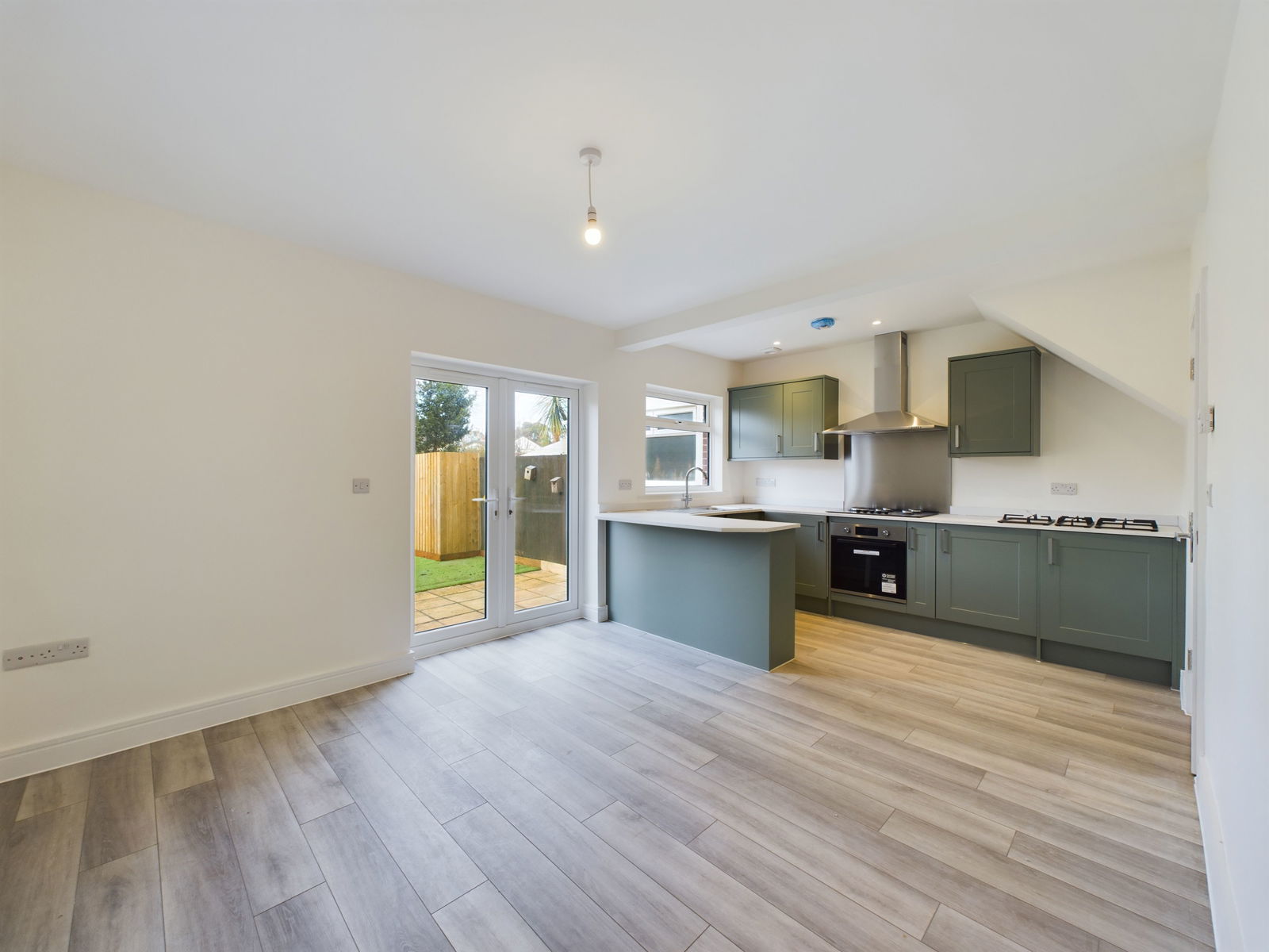 KITCHEN/DINER/LOUNGE A beautifully appointed kitchen area having a range of contemporary wall and base units with low profile work surfaces over. There is a top of the range integrated Lamona five burner gas hob with matching oven/grill below and a stainless steel splashback and cooker hood over. Further integrated appliances include dishwasher, washing machine, fridge, and freezer. The kitchen area opens to a generous dining space which could also accommodate a small snug area. Double glazed French doors leading to the rear garden and enjoying an open outlook. Double aspect double glazed windows. Radiator. TV point. Grey wood effect flooring throughout. Digital programmer for central heating and hot water.