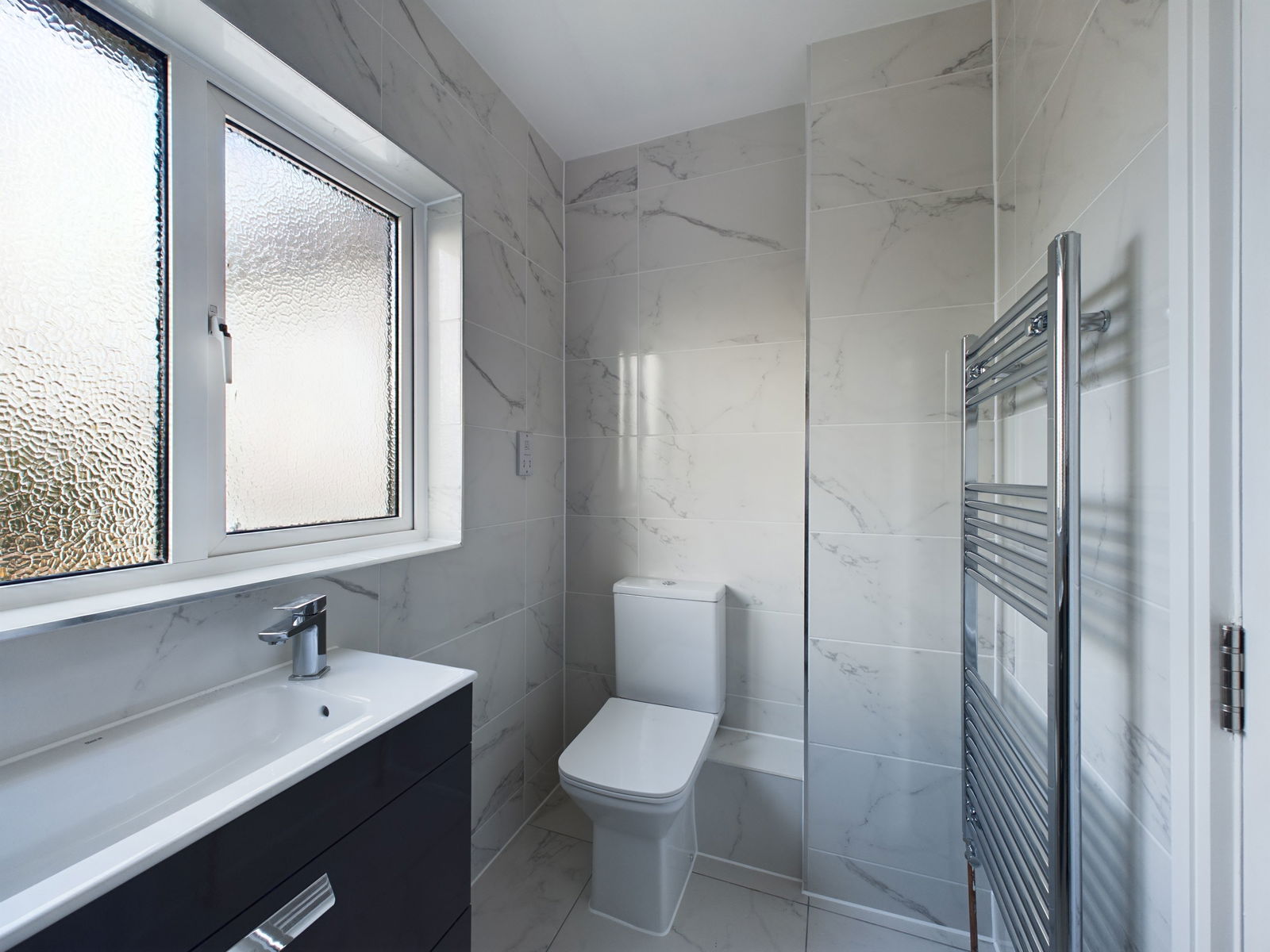 SHOWER ROOM Well appointed with a contemporary range of Roca sanitary ware comprising vanity unit with inset wash and basin and chrome mixer tap. Close couple WC with dual flush plus there is a double width shower cubicle with mains fed shower unit plus drench shower-head and body spray. Fully tiled walls and floor. Shaver point. Double glazed window. Chrome ladder radiator.