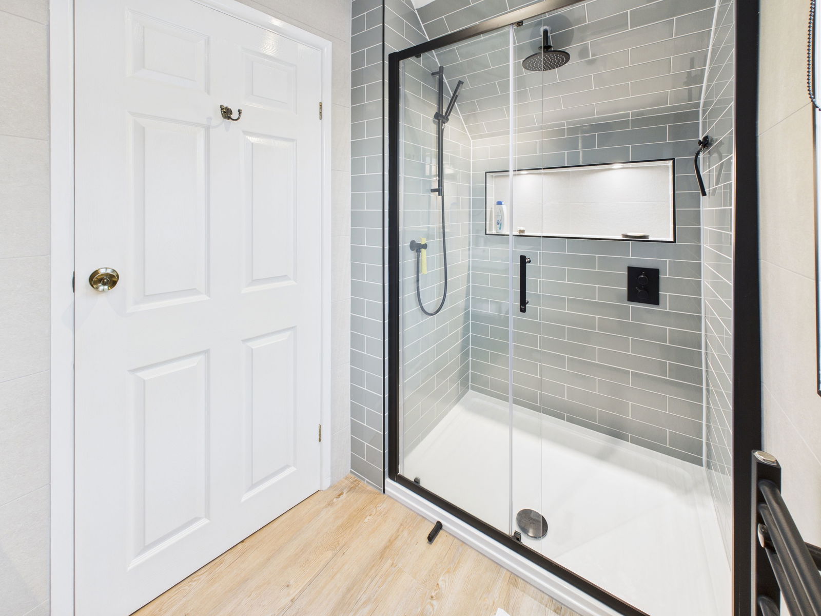 EN-SUITE A luxurious, spa like en-suite featuring a low level WC, vanity wash hand basin with storage beneath and a walk in double shower. Finished with modern tiling, an obscure uPVC double glazed window, extractor fan and a sleek black heated towel rail.