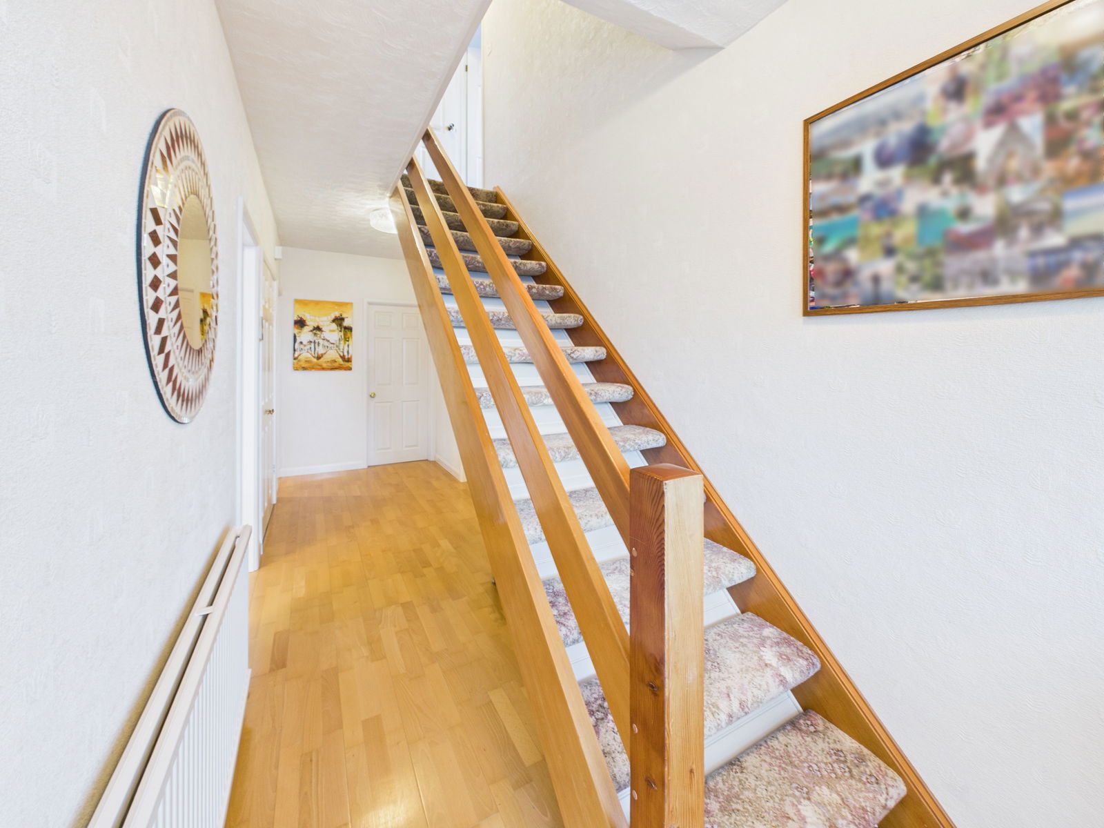 HALLWAY A wide and inviting hallway with stairs rising to the first floor and doors providing access to the principal ground floor rooms. Additional features include deep fitted storage cupboards, thermostat heating controls and a gas central heating radiator.