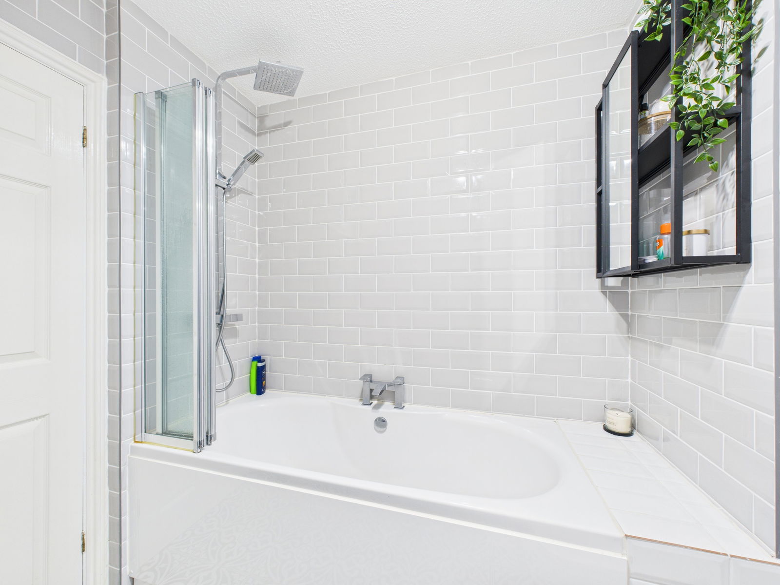 FAMILY BATHROOM A sleek and contemporary bathroom suite comprising a panelled bath with shower attachments, low level flush WC, vanity wash hand basin with storage below, chrome heated towel rail, modern tiling and an extractor fan.