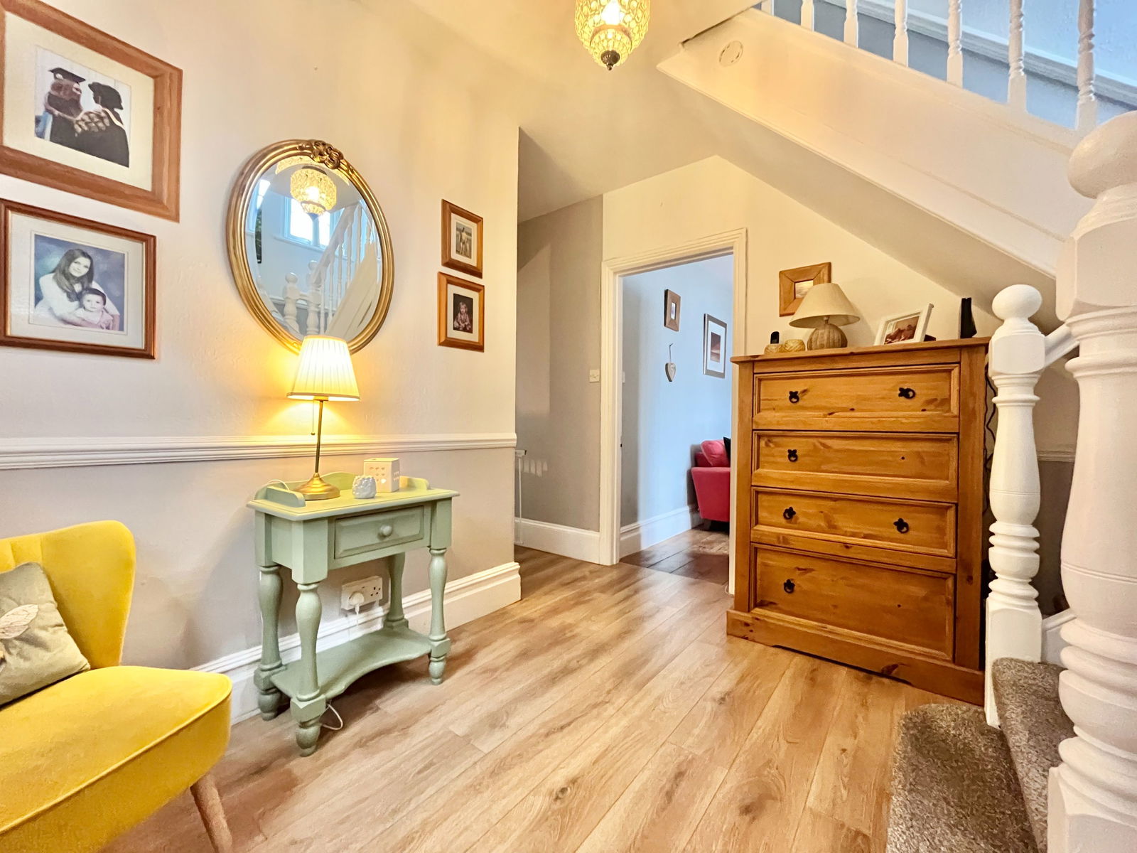HALLWAY An original 1930’s front door opening into a wide and welcoming entrance hallway with doors leading to the adjoining rooms, stairs rising to the first floor, built in storage underneath the stairs, overhead lighting a single glazed sash window and thermostat heating control.