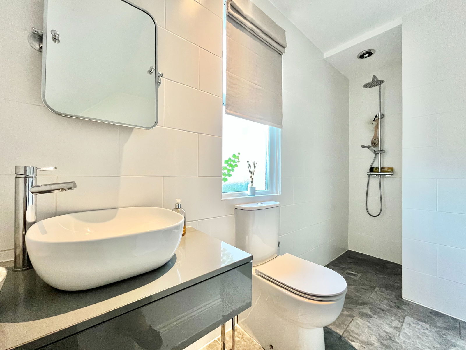 SHOWER ROOM A modern wet room that boasts a low level flush WC, a vanity unit with a freestanding wash hand basin and a walk in shower area with tiled walls and flooring. uPVC obscure double glazed window and a grey heated towel rail.