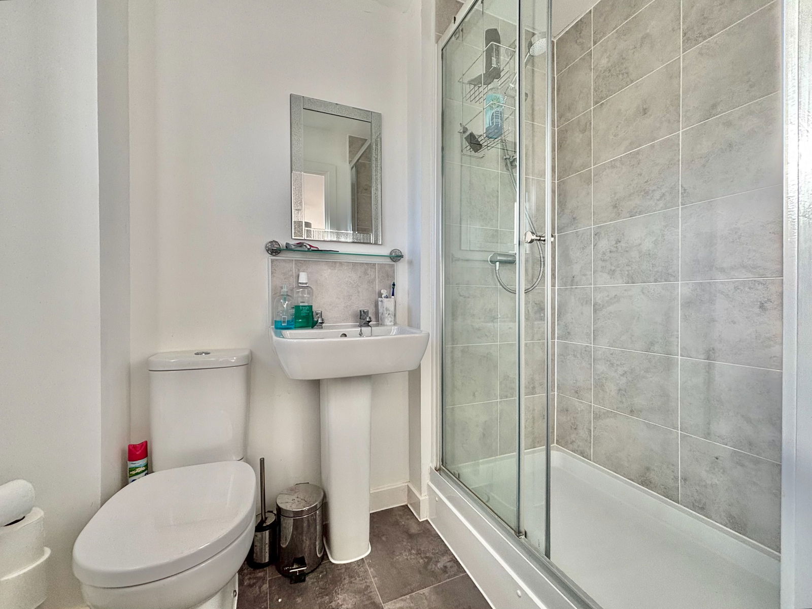 EN-SUITE A spacious master en-suite comprising of a low level flush WC, a pedestal wash hand basin and a walk in double shower unit. Part tiled walls, uPVC obscure double glazed window and a gas central heated radiator.