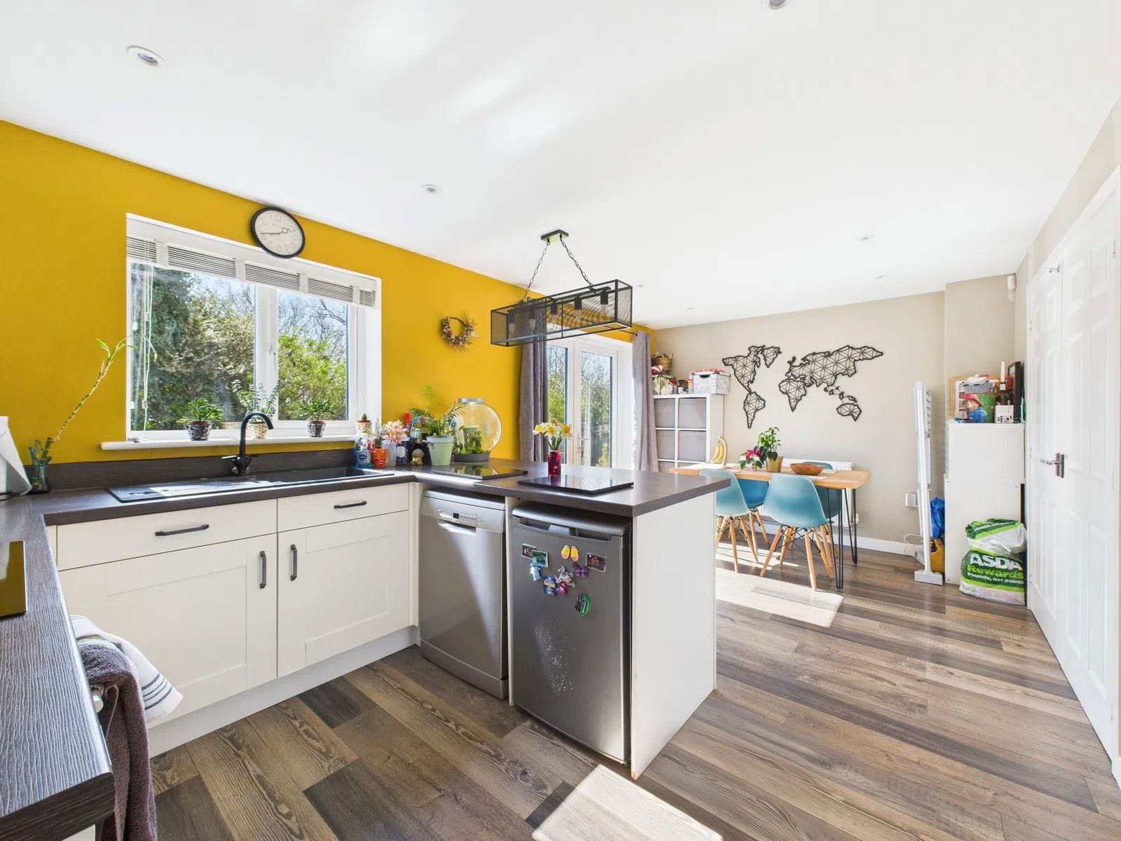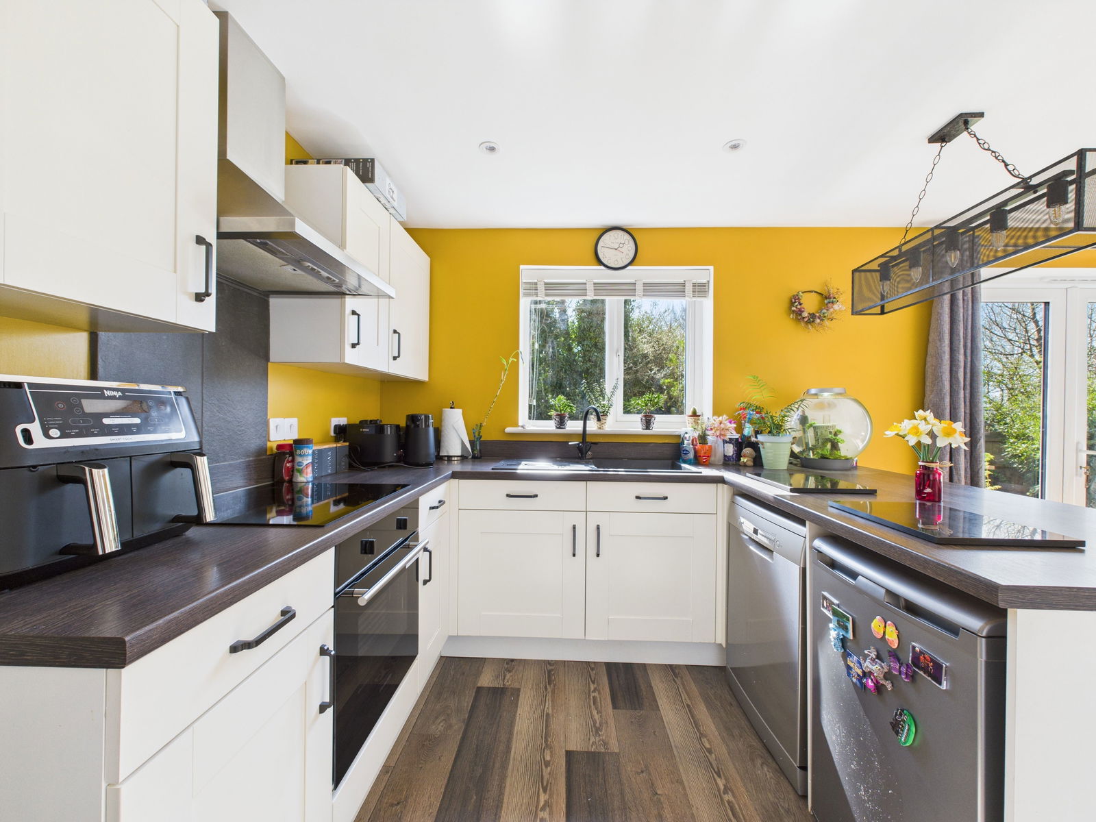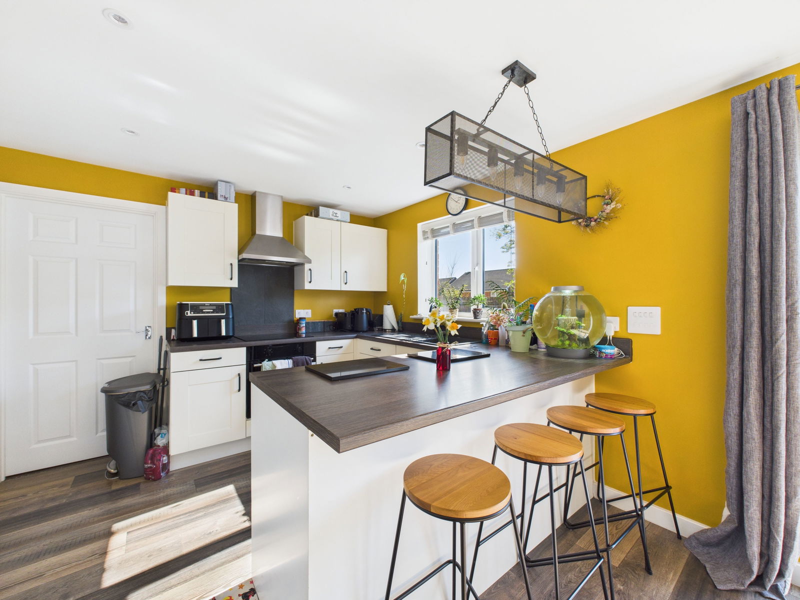 KITCHEN/DINER A beautifully modern open plan kitchen/diner boasting a range of overhead, base and drawer units with roll edged work surfaces above. A 1 bowl composite sink and drainer unit, an electric single oven with grill integrated and a four ring induction hob with extractor hood above. Space and plumbing for a dishwasher and fridge. Breakfast bar seating for four, space for a 6 seater dining table, a deep walk in pantry cupboard, uPVC double glazed window, uPVC double glazed French doors leading out to the sun soaked gardens and gas central heated radiator.