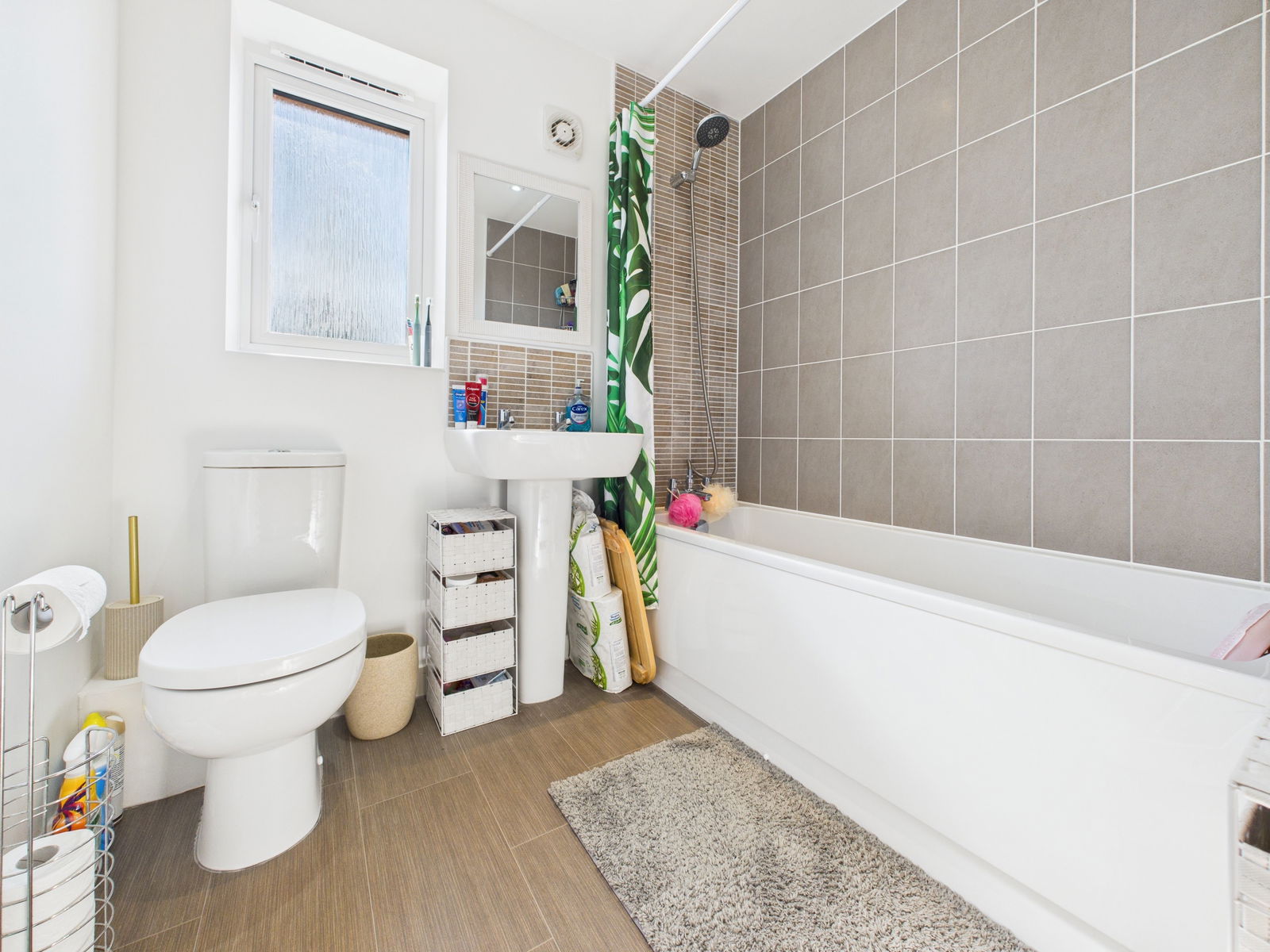 BATHROOM A contemporary family bathroom comprising of a low level flush WC, a pedestal wash hand basin and a panelled bath unit with shower attachments above. Tiled walls, extractor fan, uPVC double glazed obscure window and a gas central heated radiator.